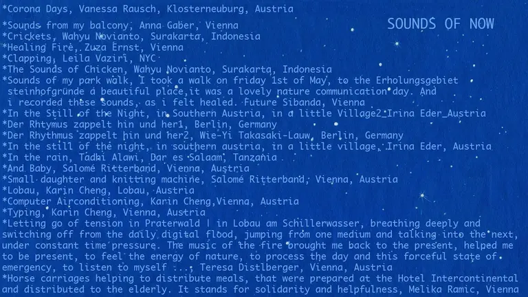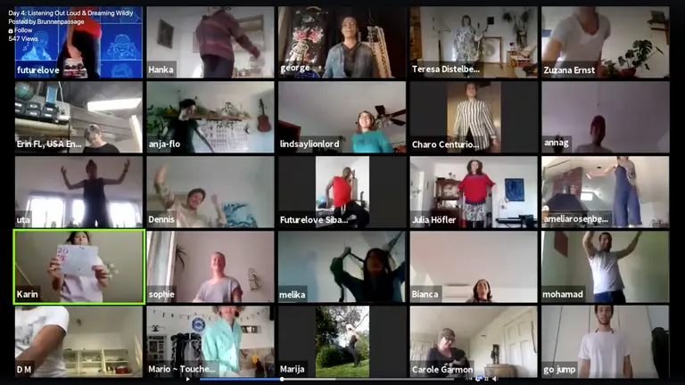 With 21 Days Listening Out Loud & Dreaming Wildly, the JUMP!STAR team facilitated an a freely accessible virtual meeting space, where people from all over the world could gather to spend 80 minutes daily together. Artists from Vienna Simmering were invited to lead these meetings and discuss with the attendees, sing together, jump, listen aloud and dream wildly together and express wishes for the future. Futurelove Sibanda composed the song Are You Ready?. The attendees were invited to join in the singing. From day 11, Sibanda requested that attendees record the song in their own language and return it to him to rehearse before performing it in the new languages from day 12 onwards. In the final session, Futurelove delivered the song in 15 different languages: Arabic, Bulgarian, English, French, German, Indonesian, Italian, Ndebele, Romanian, Serbian, Shona, Slovak, Spanish, Swahili, Tagalog.