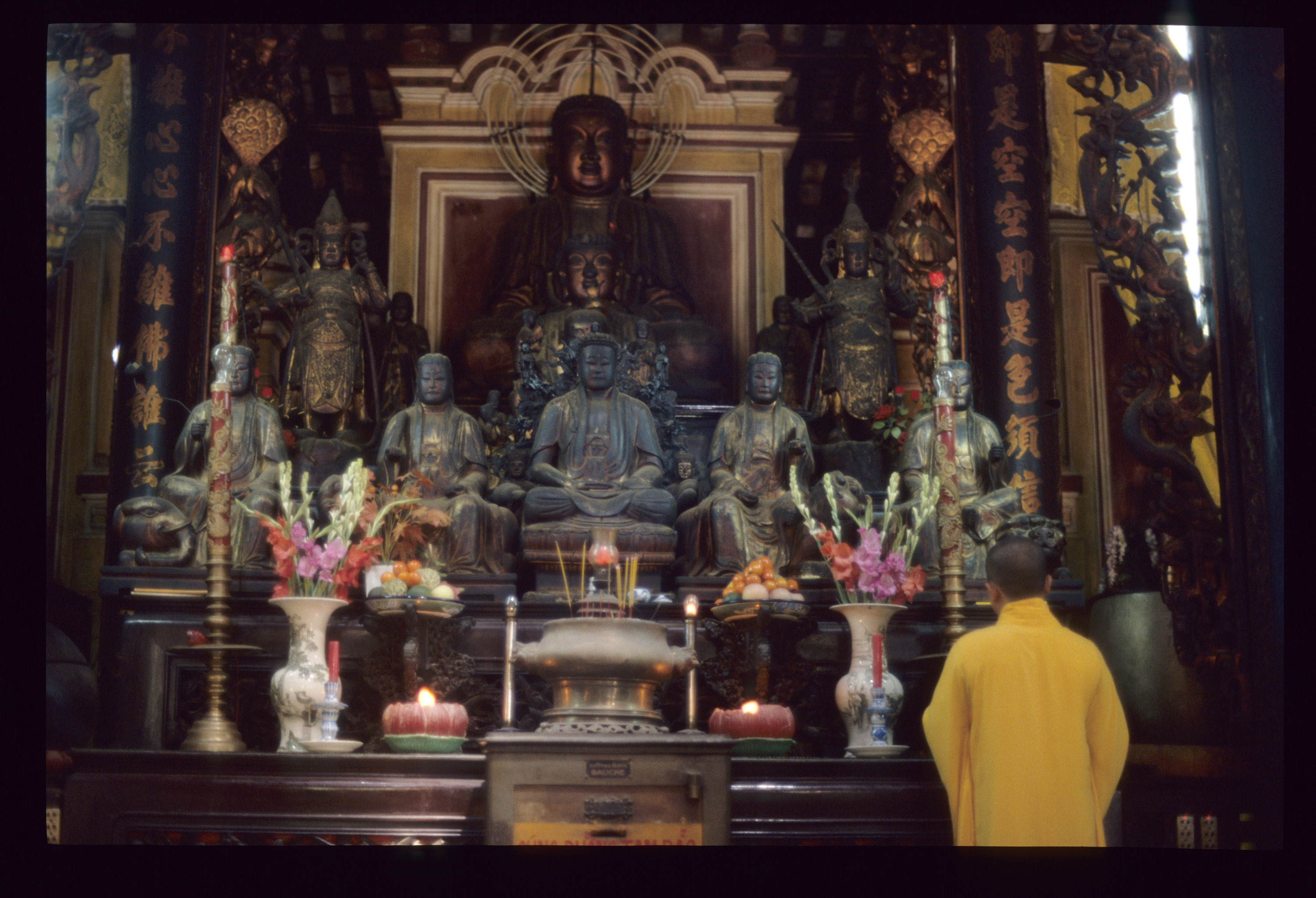 Mönch vor Buddhastatuen auf dem Altar
