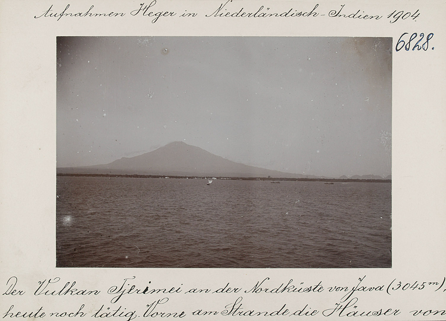 Der Vulkan Tjerimei an der Nordküste von Java (3045 m); heute noch tätig. Vorne am Strande die Häuser von Cirebon