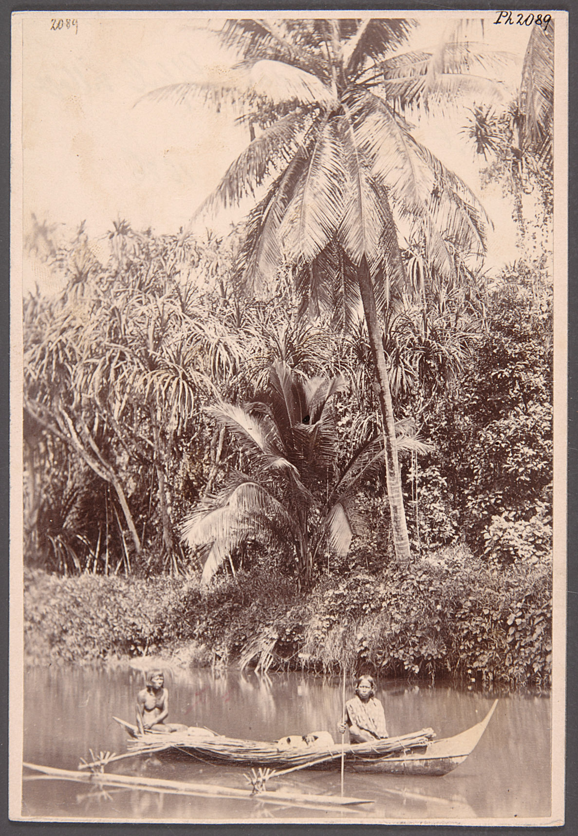 Landschaft "In a creek near Lápil village, Great Nicobar. The canoe is loaded with split cane, a large trade in which is carried on by the natives of Gt. Nicobar with their neighbours as well as with traders