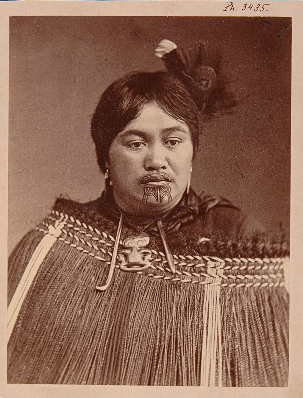 Harieta Pongowhitiao, wife of a chief, clothed with an Itau, wearing a Hei-Tiki, a figure made of greenstone, she is also wearing two Tara ear-pendants showing her high rank. North Island.
