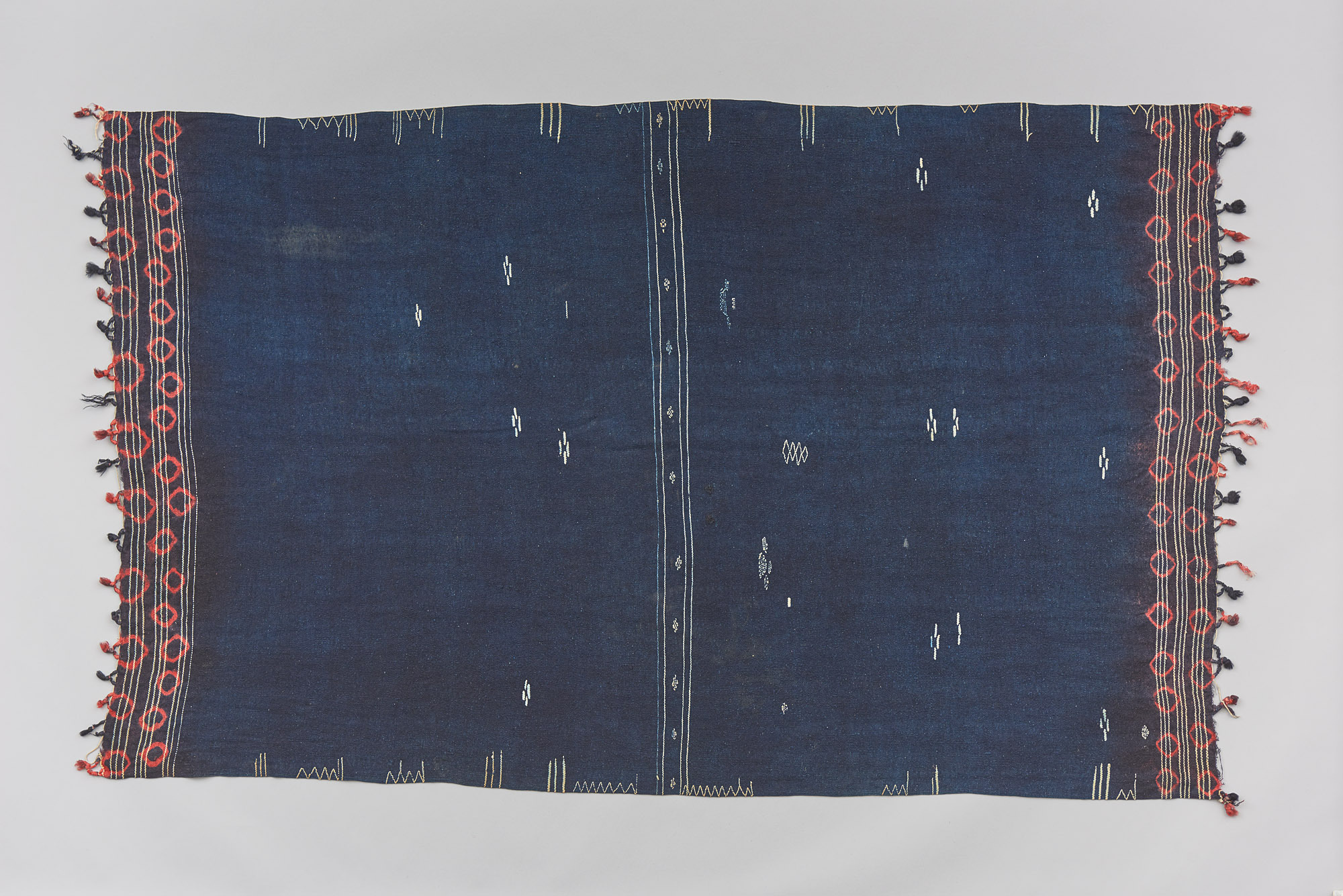 The bakhnūg is a rectangular woolen head- or shoulder-scarf, aproximately 200 x 100 cm in size, worn by girls and women. It is soberly decorated (two or three narrow lines along the border, a small piece of individual embroidery in one corner, a fish, a star, a line) or with large planes of linear or geometrical designs woven into the fabric (straight, diagonal or zig-zag lines, dots, angles, triangles or a rhombus with endless possibilities of combinations). Besides shielding its wearer from unwanted looks from strangers, the bakhnūg served as a protection during cold nights or in winter. In the peasant-nomadic societies of the Berbers of central and southern Tunisia, each region, each clan, each village developed its own ethnic and magical-religious repertoire of designs that were passed down from generation to generation.