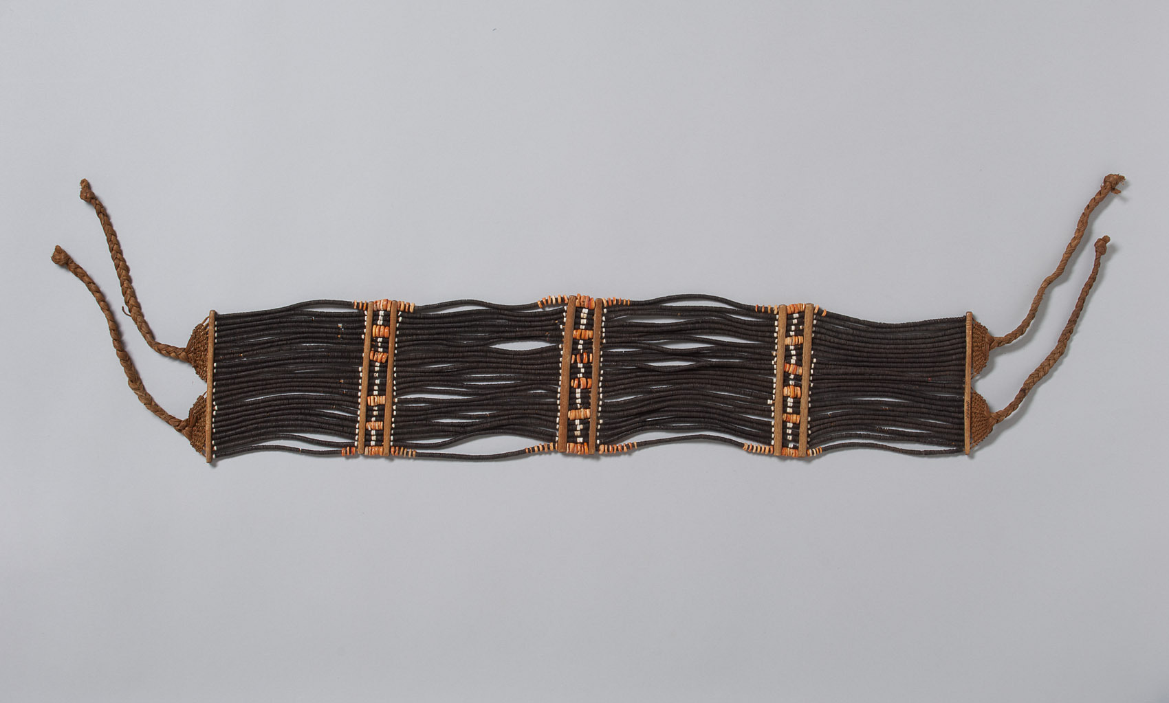 Slices of coconut shell, spondylus shell and cone shell, wood, coconut fibre