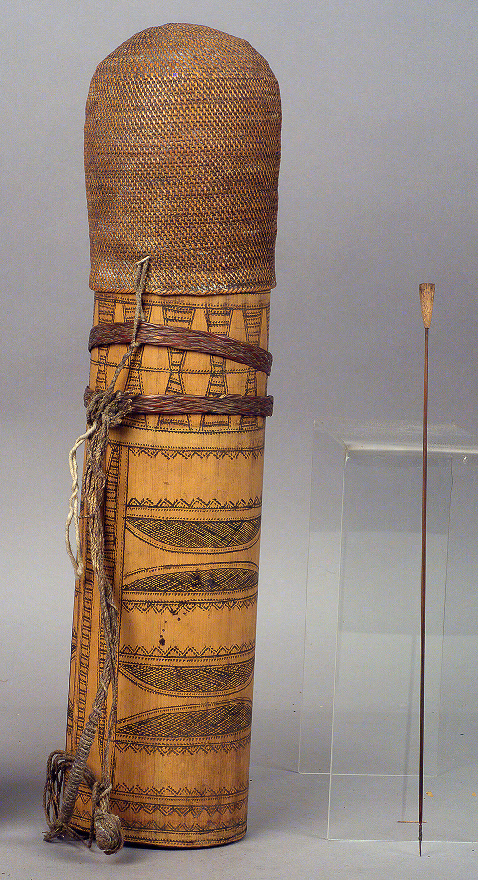 The Semang kept their specific form of modified arrow quivers. Together with the blowpipe, however, they also adopted this typical form of blowpipe dart quivers from the Senoi.