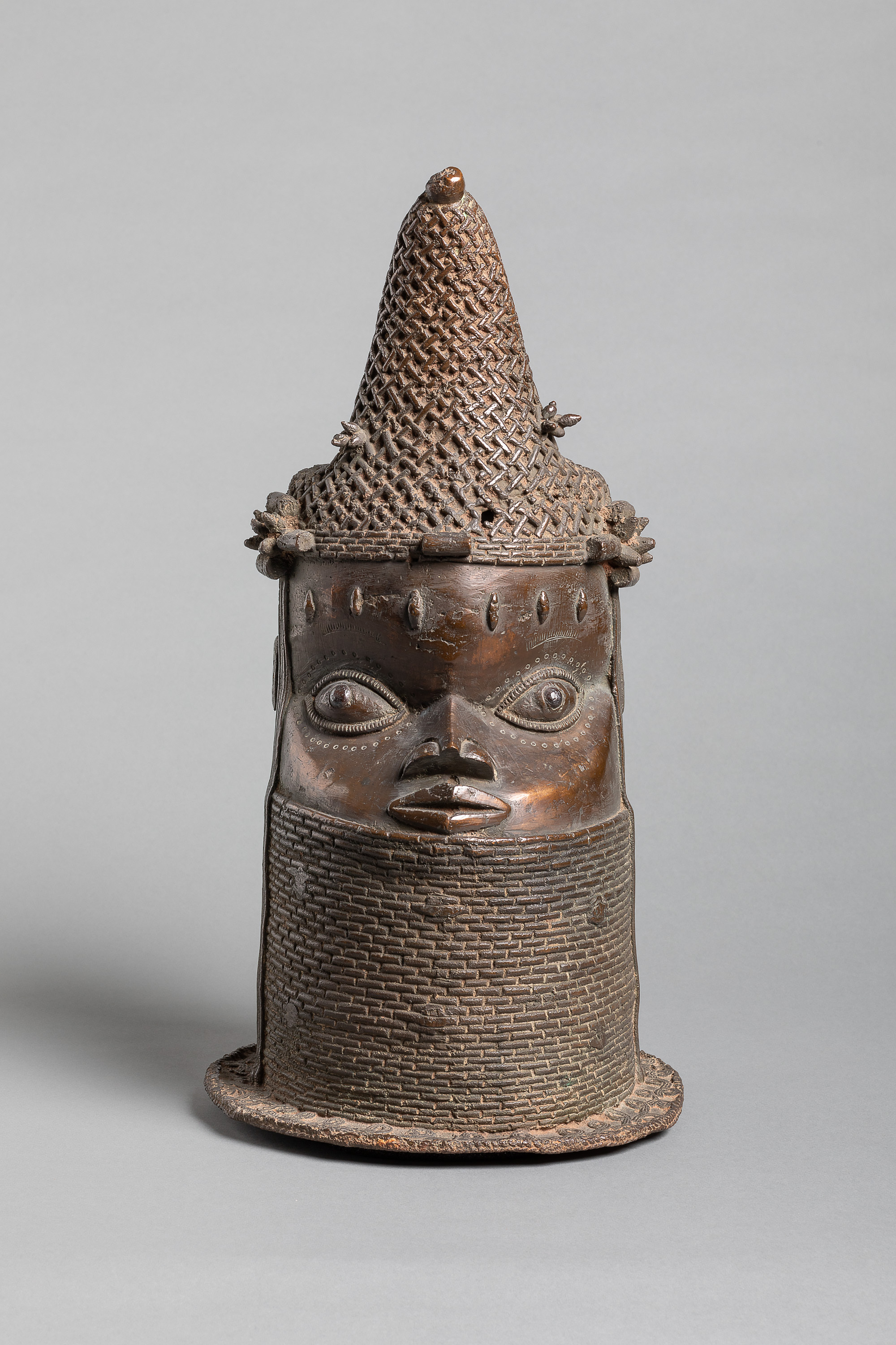 This Commemorative Head of a Queen Mother part of the historical collections from the Benin Kingdom, in present-day Nigeria. In 1897, the kingdom was conquered and Oba (king) Ovonramwen banned into exile. The loot from the royal palace was then sold through the art market to finance the conquest in retrospect. Many of these objects today constitute European collections.