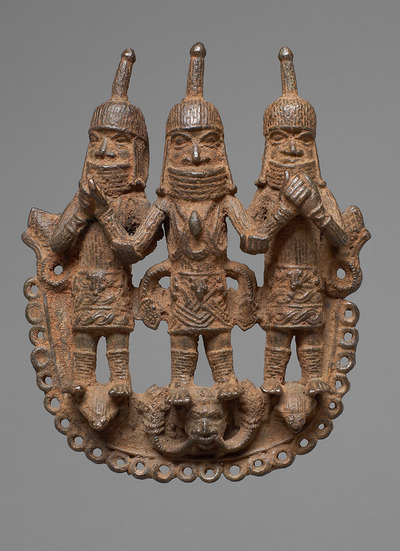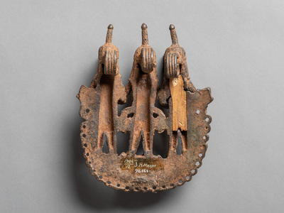This Pendant with Royal Triad is part of the historical collections from the Benin Kingdom, in present-day Nigeria. In 1897, the kingdom was conquered and Oba (king) Ovonramwen banned into exile. The loot from the royal palace was then sold through the art market to finance the conquest in retrospect. Many of these objects today constitute European collections.