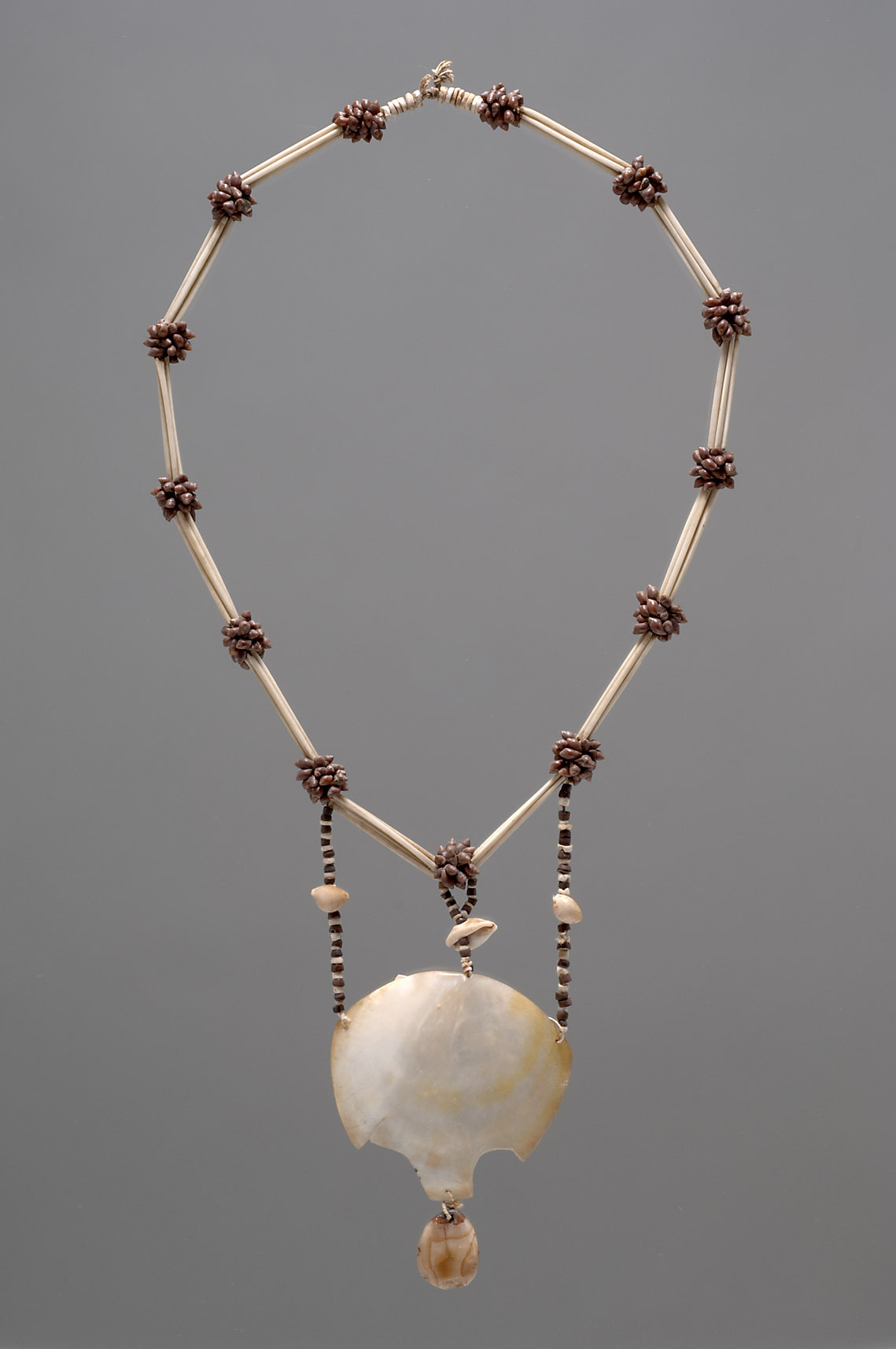 Pearl shell, bird bones, snail shells, coconut shells, plant fibres