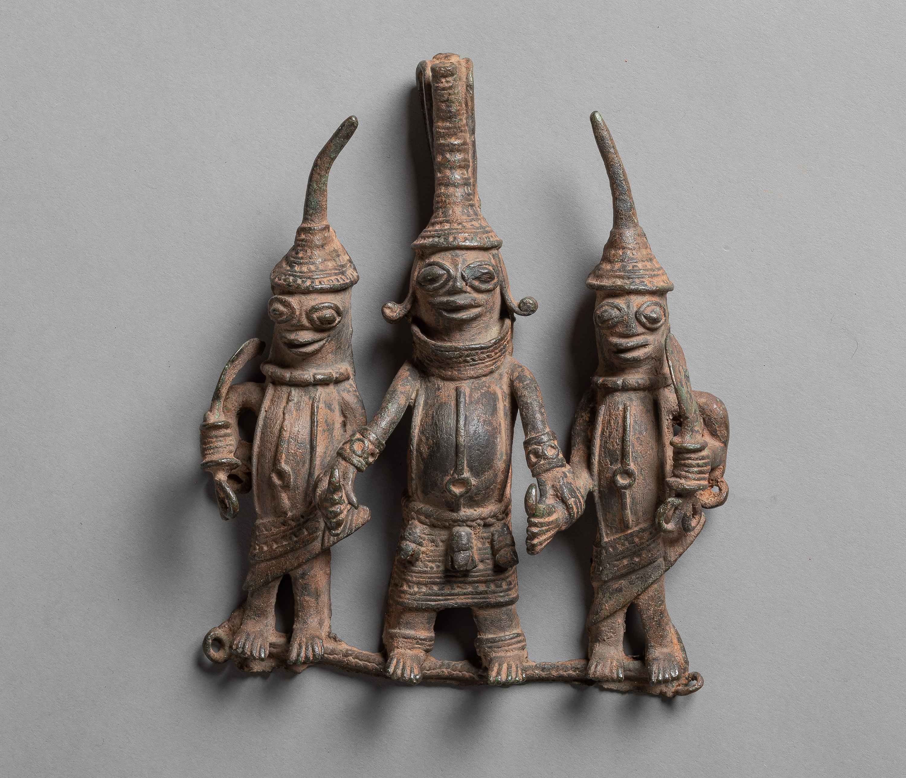 This Pendant, Royal Triad is part of the historical collections from the Benin Kingdom, in present-day Nigeria. In 1897, the kingdom was conquered and Oba (king) Ovonramwen banned into exile. The loot from the royal palace was then sold through the art market to finance the conquest in retrospect. Many of these objects today constitute European collections.