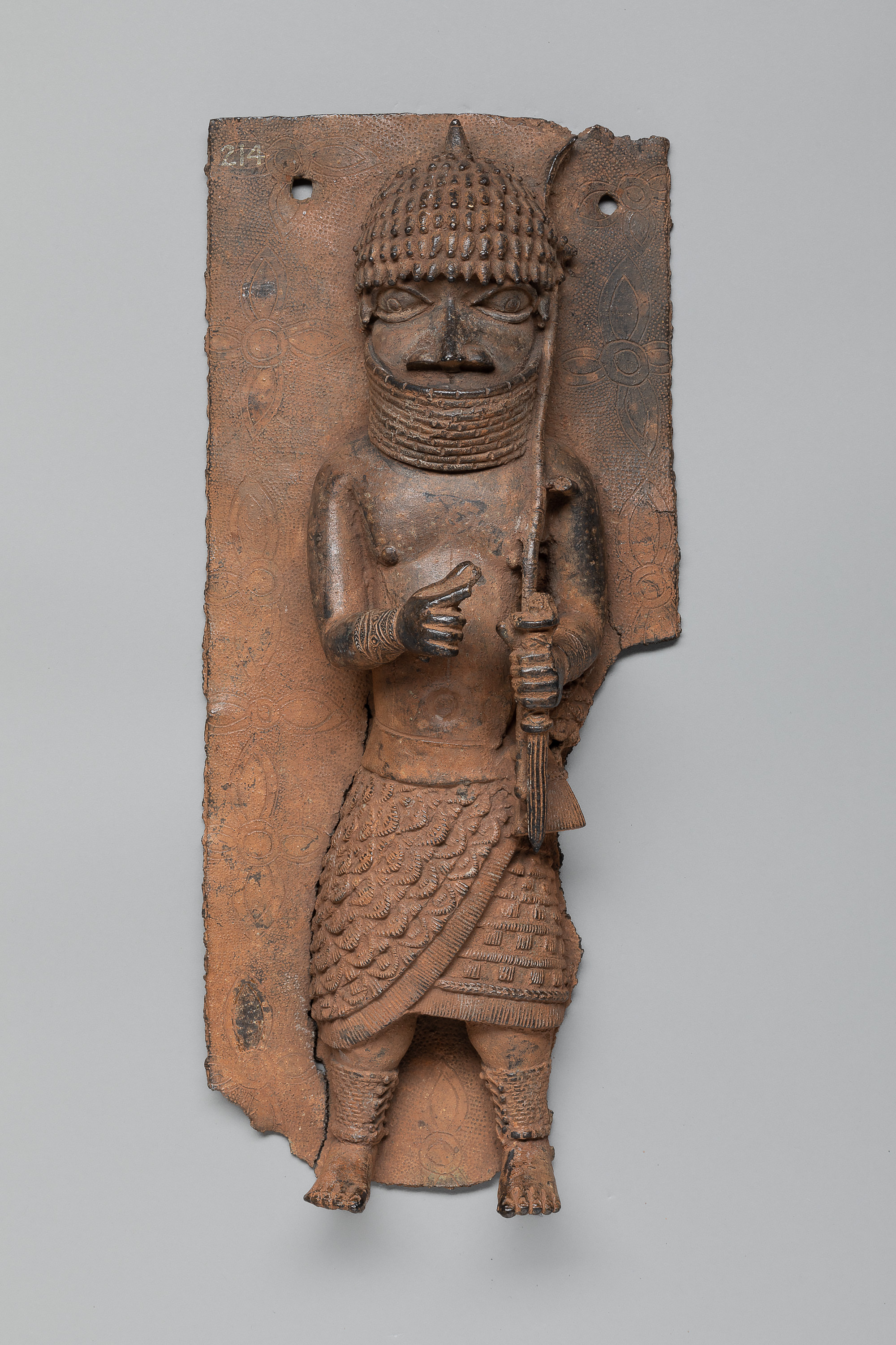 This Relief Plaque: Dignitary is part of the historical collections from the Benin Kingdom, in present-day Nigeria. In 1897, the kingdom was conquered and Oba (king) Ovonramwen banned into exile. The loot from the royal palace was then sold through the art market to finance the conquest in retrospect. Many of these objects today constitute European collections.