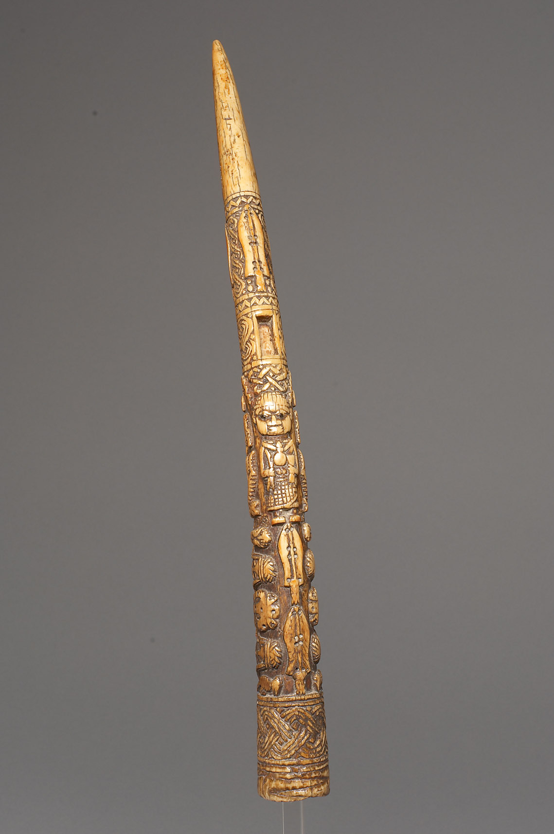 This Ivory Horn is part of the historical collections from the Benin Kingdom, in present-day Nigeria. In 1897, the kingdom was conquered and Oba (king) Ovonramwen banned into exile. The loot from the royal palace was then sold through the art market to finance the conquest in retrospect. Many of these objects today constitute European collections.