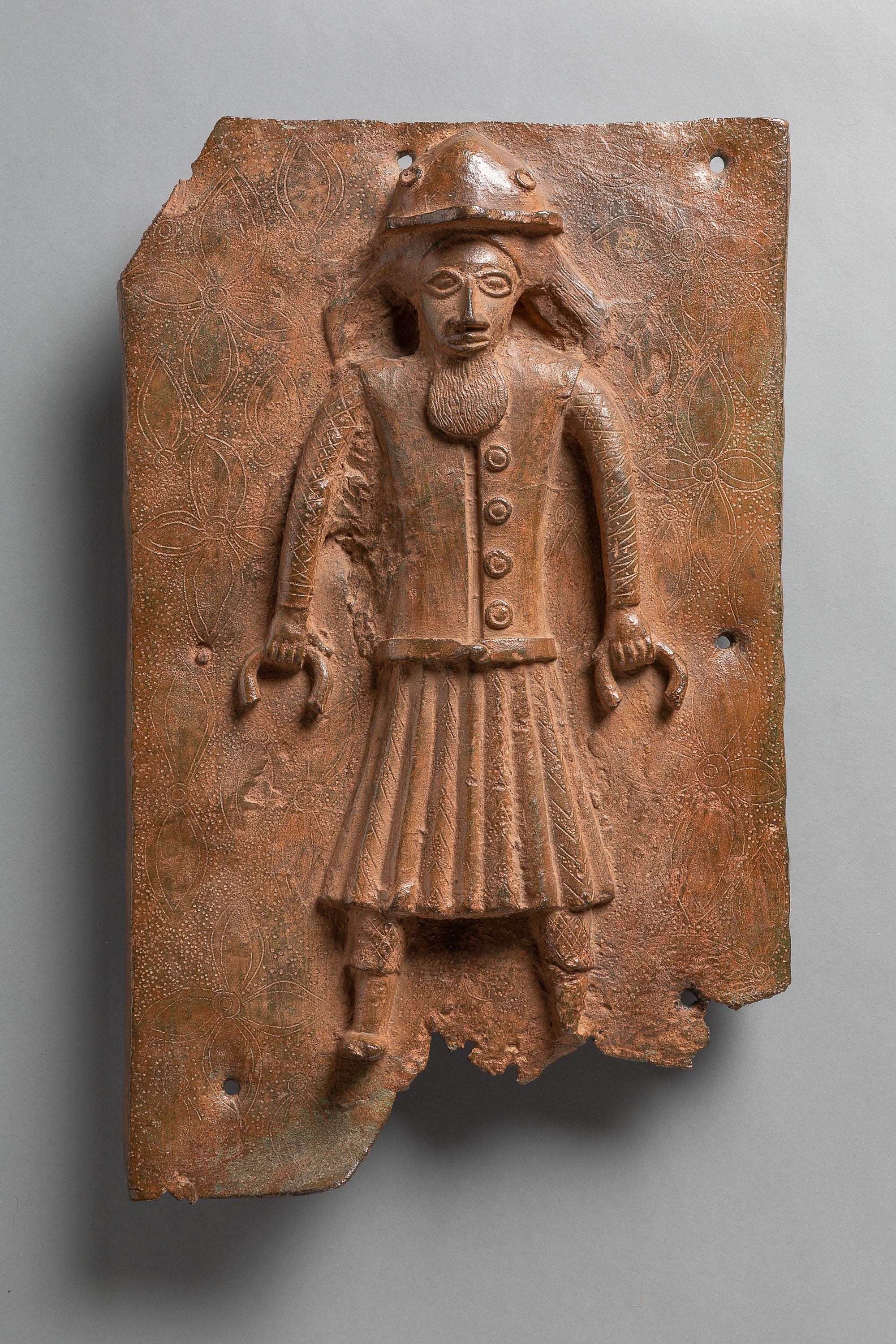 This Relief Plaque: Portuguese with two Manillas is part of the historical collections from the Benin Kingdom, in present-day Nigeria. In 1897, the kingdom was conquered and Oba (king) Ovonramwen banned into exile. The loot from the royal palace was then sold through the art market to finance the conquest in retrospect. Many of these objects today constitute European collections.