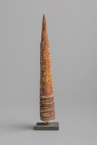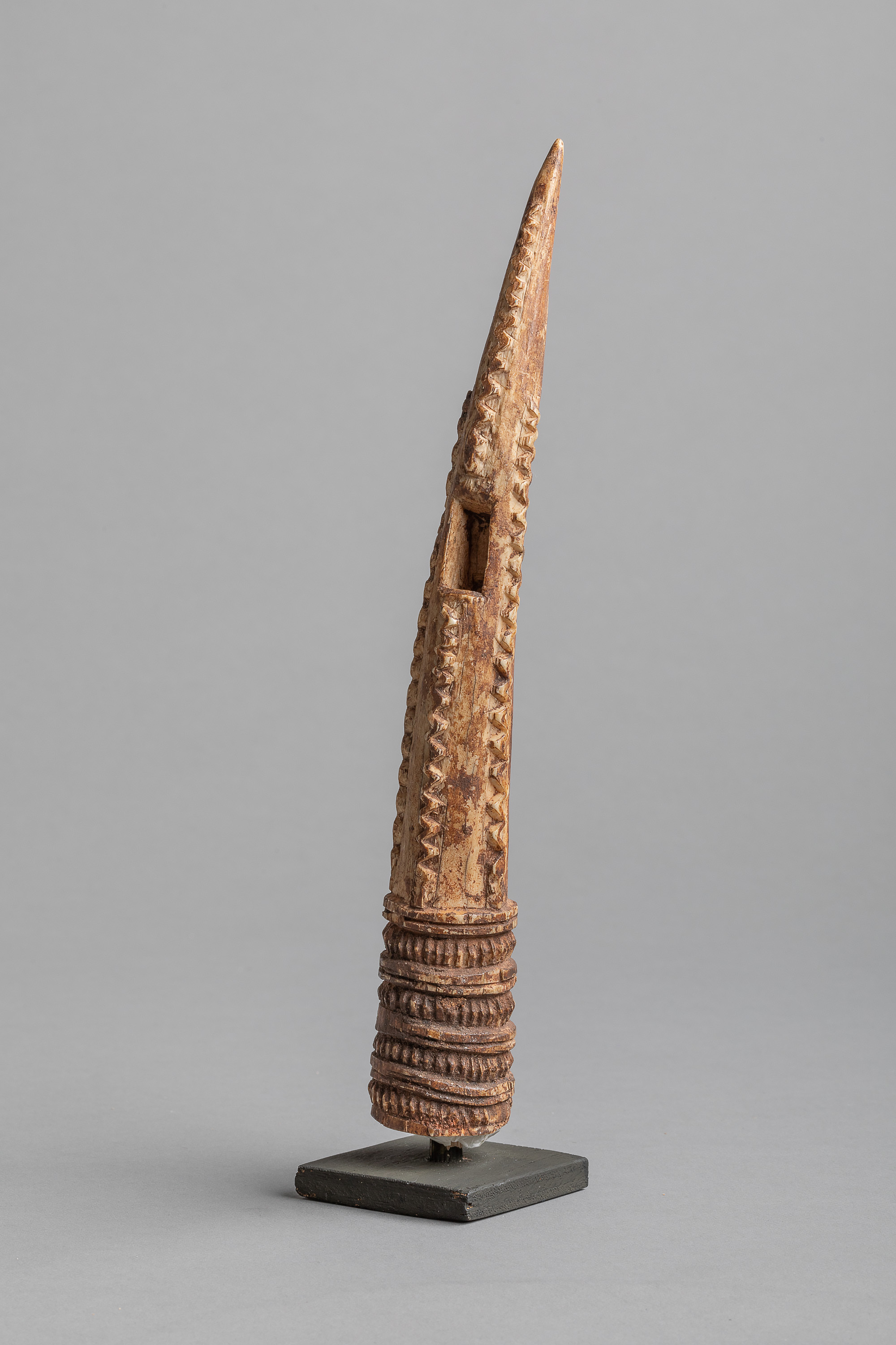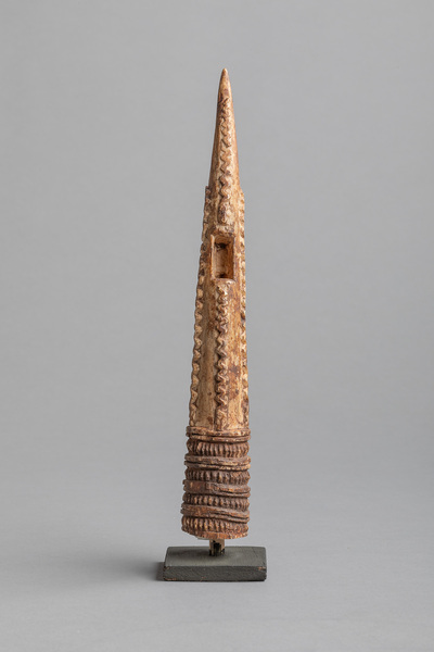 This Side-blown Ivory Horn is part of the historical collections from the Benin Kingdom, in present-day Nigeria. In 1897, the kingdom was conquered and Oba (king) Ovonramwen banned into exile. The loot from the royal palace was then sold through the art market to finance the conquest in retrospect. Many of these objects today constitute European collections.