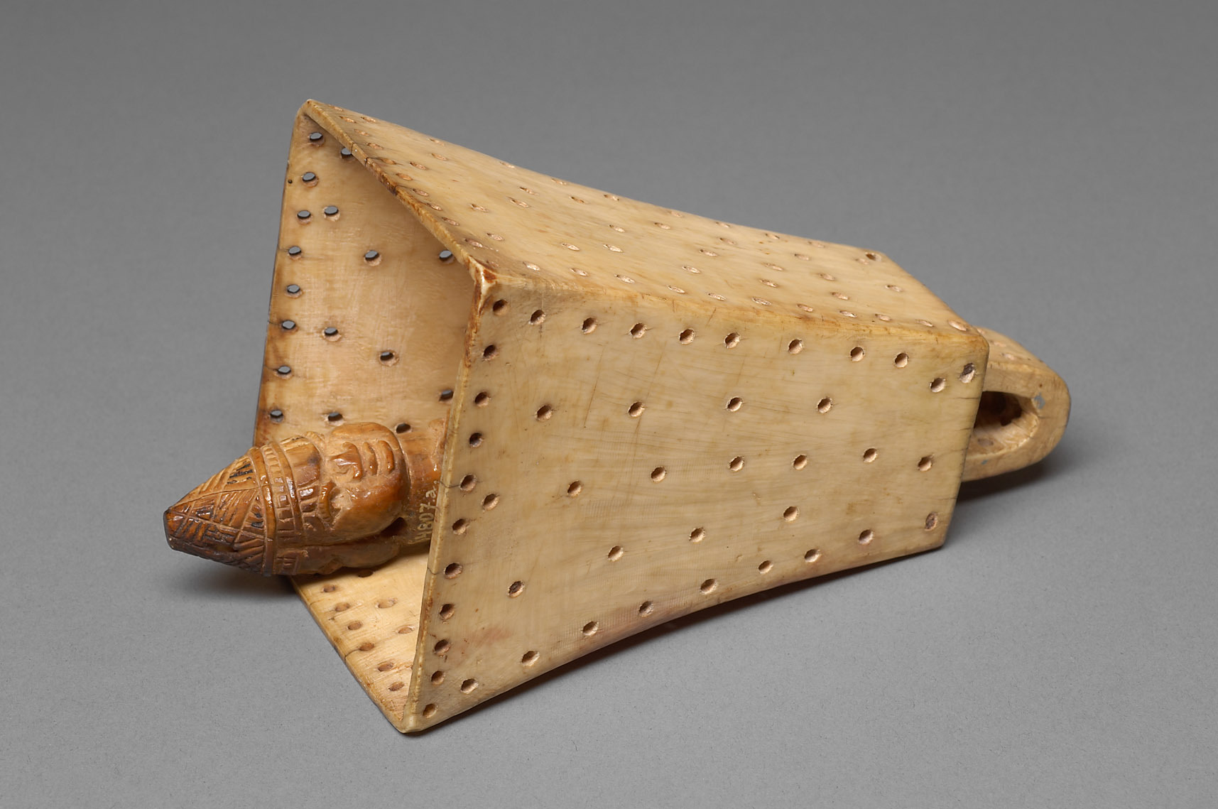 This Ivory Bell with Figurative Clapper is part of the historical collections from the Benin Kingdom, in present-day Nigeria. In 1897, the kingdom was conquered and Oba (king) Ovonramwen banned into exile. The loot from the royal palace was then sold through the art market to finance the conquest in retrospect. Many of these objects today constitute European collections.