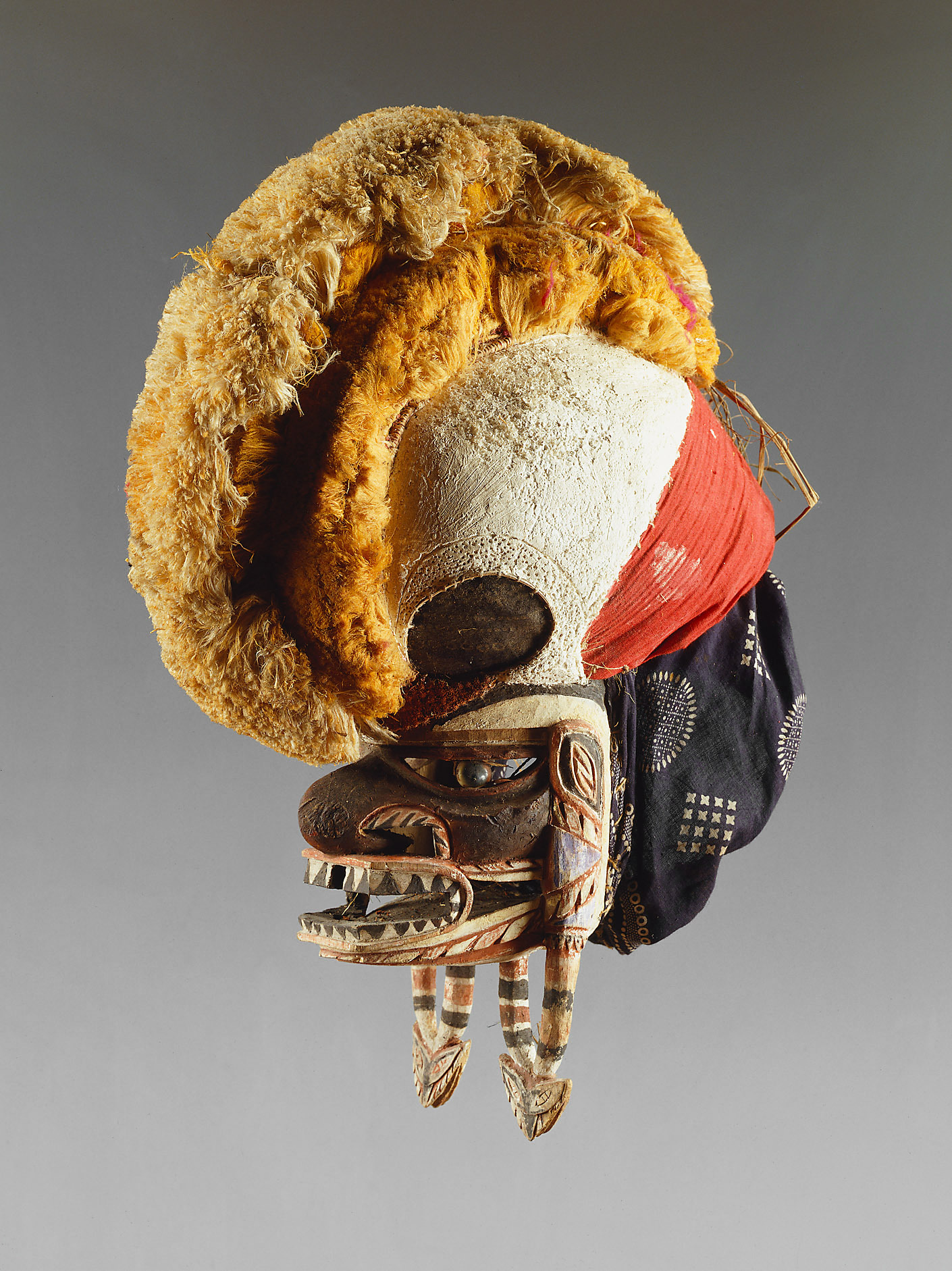 The dancers at malagan death rituals, during which both creator spirits and ancestors came back to life for a short period of time, wore colourful mask costumes. The human features of the masks imaginatively blended with representations of birds, fish, pigs, and reptiles. Their eyes with snail shell inlays allow the carved masks to appear almost alive. The caterpillar-like hairstyle of these tatanua masks is reminiscent of the hair of close relatives during the months of mourning.