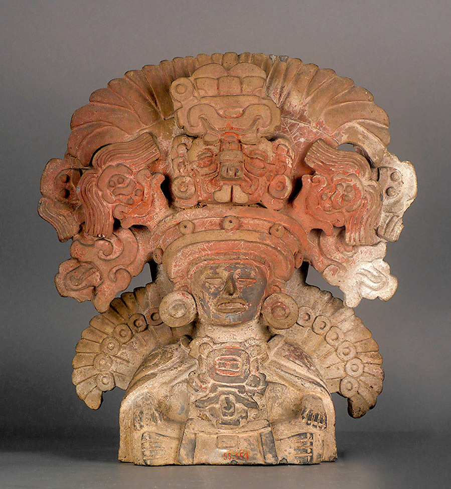 This figure depicts the young maize deity. Maize was one of the main sources of nourishment in pre-Spanish Mesoamerica, and was thus considered a sacred plant.The maize deity is shown sitting cross-legged on the floor. His hands lie on his knees. He wears a huge and elaborate head-dress. Note the mask of the Zapotec rain deity Cocijo at its centre.The rain deity makes sure that the earth receives enough water to make the maize grow and is characterised by rings like glasses around his eyes. The split tongue of a serpent protrudes from his mouth. The rain deity also wears a head-dress formed by the glyph C. Glyphs are the pictorial and syllable signs of Zapotec script. The glyph C that you can make out in the rain deity‘s head-dress, depicts both a water vessel and the stylised head of a jaguar.Flanking the mask of the rain deity on either side are corn-cobs. As well as his huge head-dress, the rain deity also wears ear-disks, a pectoral, a cape and a loincloth. Note the feathers arranged like a fan behind his shoulders against which the deity seems to lean. The different parts of the figure were first cast from moulds and then assembled. Ceramic figures like this one are characteristic examples of the classical Zapotec civilisation of Monte Alban in Mexico. For two millennia, Monte Alban, close to the modern city of Oaxaca, was the most important religious and political centre in the south of Mexico.