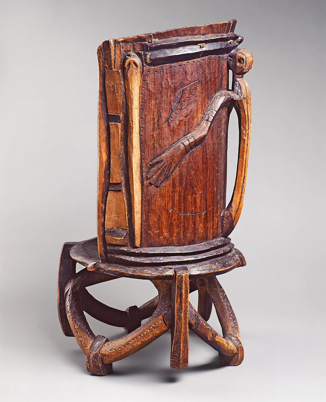Der hochlehnige Stuhl soll nach Angabe des Sammlers dem Oberhaupt der Gogo von Nsassa als Thron gedient haben. Die Gogo leben heute im zentralen Tanzania südöstlich des Nyamwezi-Flusses. An der Außenfläche der hohen Rückenlehne ist der langgliederige Oberkörper einer menschlichen Figur abgebildet, die die Lehne zu umarmen scheint.