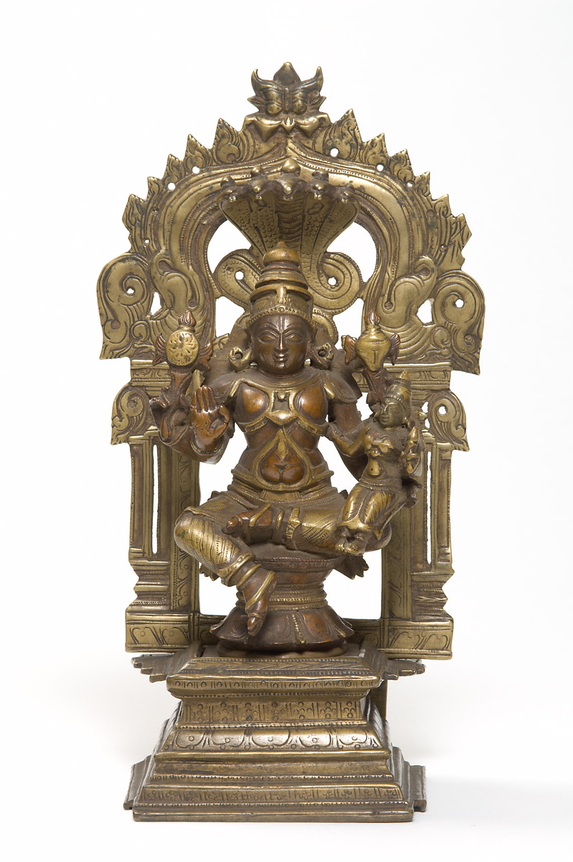 On Vishnu's knee sits his consort Lakshmi, the goddess of happiness and prosperity. Together they embody royal authority.