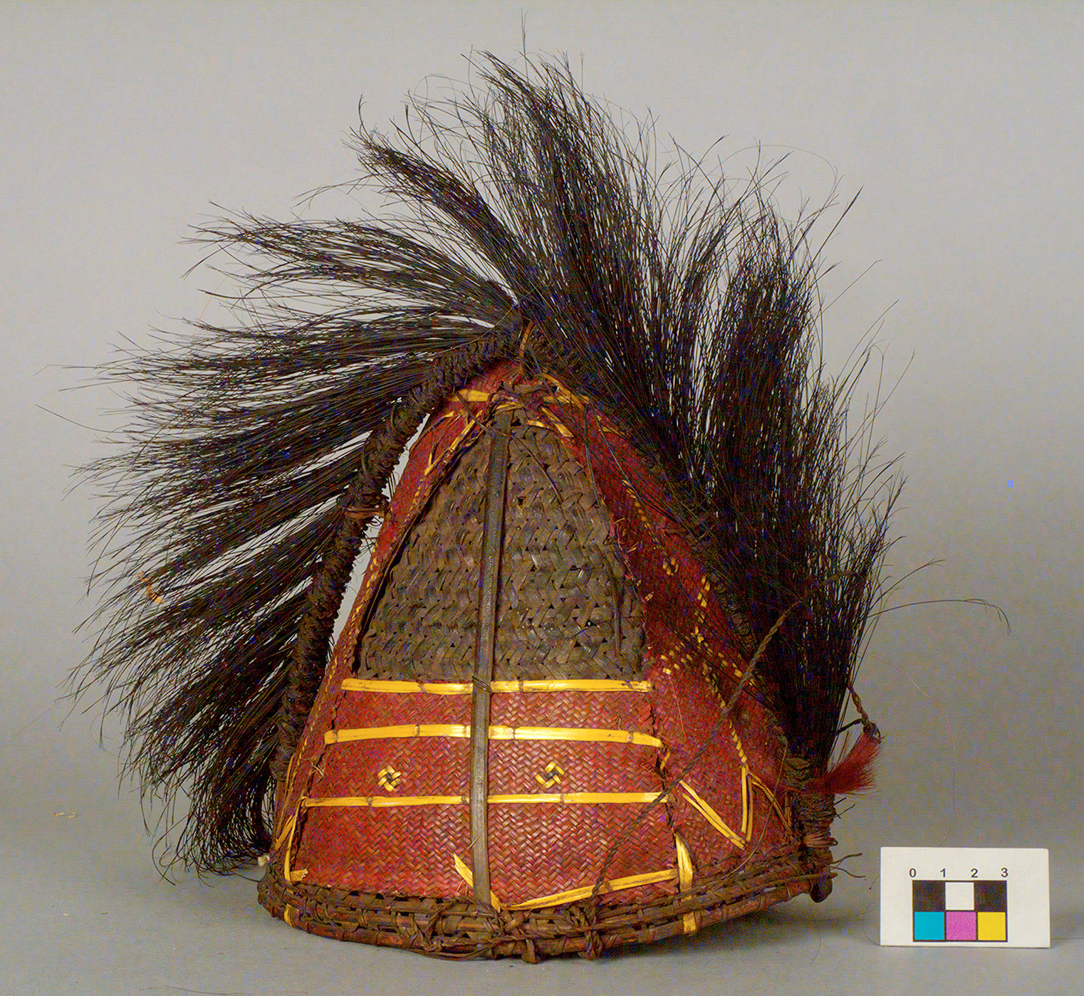 During festivals and ceremonies, Naga men transformed everyday objects such as hats, baskets and spears into elaborately designed ornaments. While some tribes were relatively uniform in their hats, the Konyak-Naga were guided by the principle: the more striking and imaginative, the better. This led to surprising solutions and expressive qualities in ritual headgear.