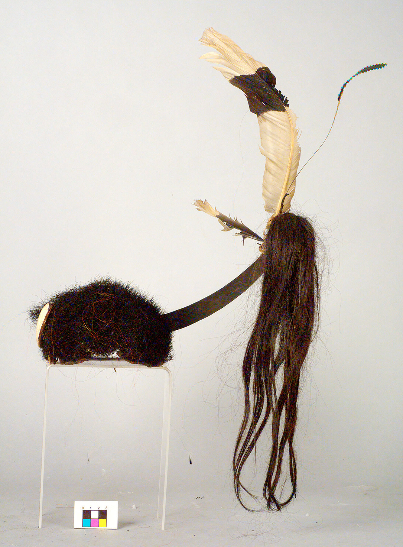 The application of animal materials follows the desire to appropriate the characteristic features of certain animals - for example the strength and courage of the leopard or boar, the invincibility of the elephant or the beauty of the hornbill. The red of the dyed goat's hair conveyed the idea of strength or blood, but also of the fire that consumed enemy villages. The feathers of the hornbill on the hats are a sign of social status among all Naga groups, albeit with different meanings depending on the group. Among the Angami, for example, a feather once referred to a captured head, among the Ao to a sacrificed buffalo. Among the Khiamniungan, two feathers indicated that the wearer had hurled the first spear at a slain enemy, while among the Sangtam they were an indication that the third of a total of five feasts of merit had been held. Today, personal taste determines the choice.