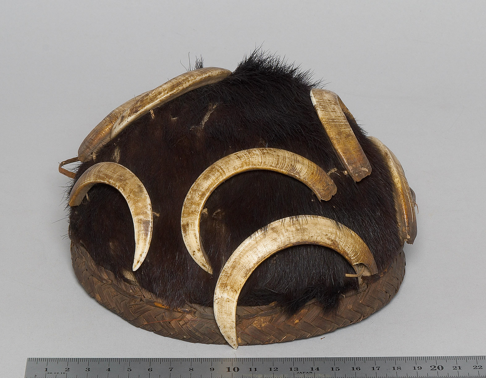 At festivals and ceremonies, Naga men transformed everyday objects such as hats, baskets or spears into elaborately designed ornaments. While some tribes were relatively uniform in their hats, the Konyak-Naga were guided by the principle that the more striking and imaginative, the better. This led to surprising solutions and expressive qualities in ritual headgear.
