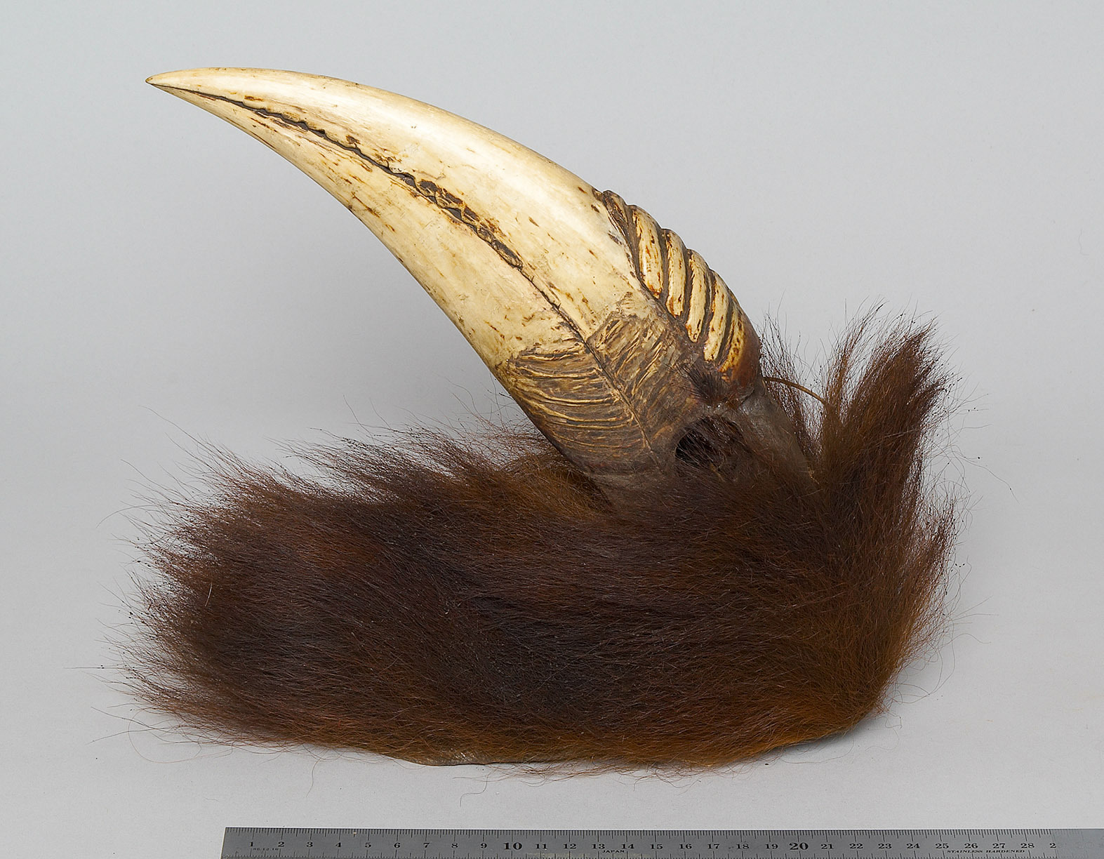 The application of animal materials follows the desire to appropriate the characteristic features of certain animals - for example the strength and courage of the leopard or boar, the invincibility of the elephant or the beauty of the hornbill. The red of the dyed goat's hair conveyed the idea of strength or blood, but also of the fire that consumed enemy villages. The feathers of the hornbill on the hats are a sign of social status among all Naga groups, albeit with different meanings depending on the group. Among the Angami, for example, a feather once referred to a captured head, among the Ao to a sacrificed buffalo. Among the Khiamniungan, two feathers indicated that the wearer had hurled the first spear at a slain enemy, while among the Sangtam they were an indication that the third of a total of five feasts of merit had been held. Today, personal taste determines the choice.