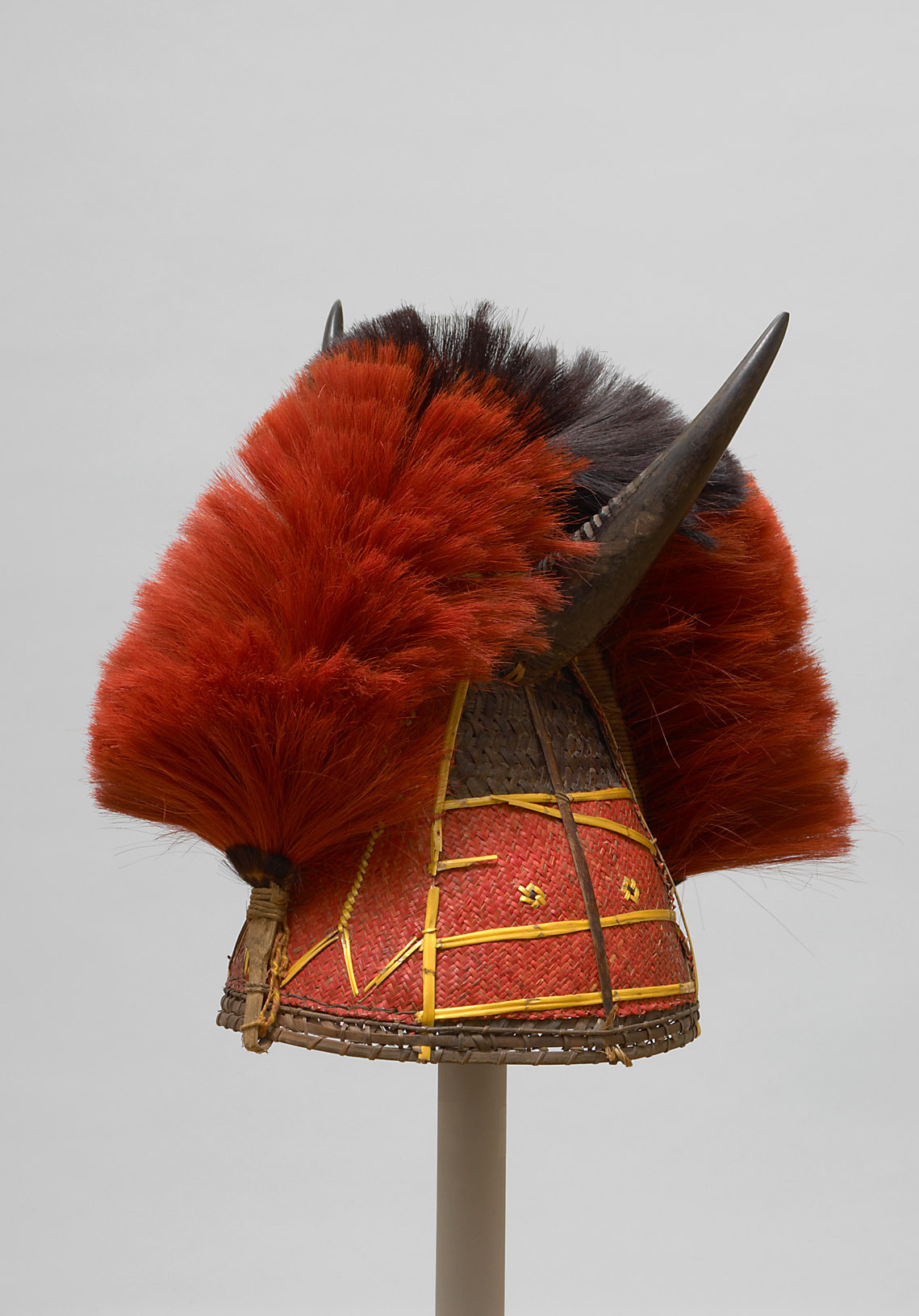 At festivals and ceremonies, Naga men transformed everyday objects such as hats, baskets or spears into elaborately designed ornaments. While some tribes were relatively uniform in their hats, the Konyak-Naga were guided by the principle that the more striking and imaginative, the better. This led to surprising solutions and expressive qualities in ritual headgear.