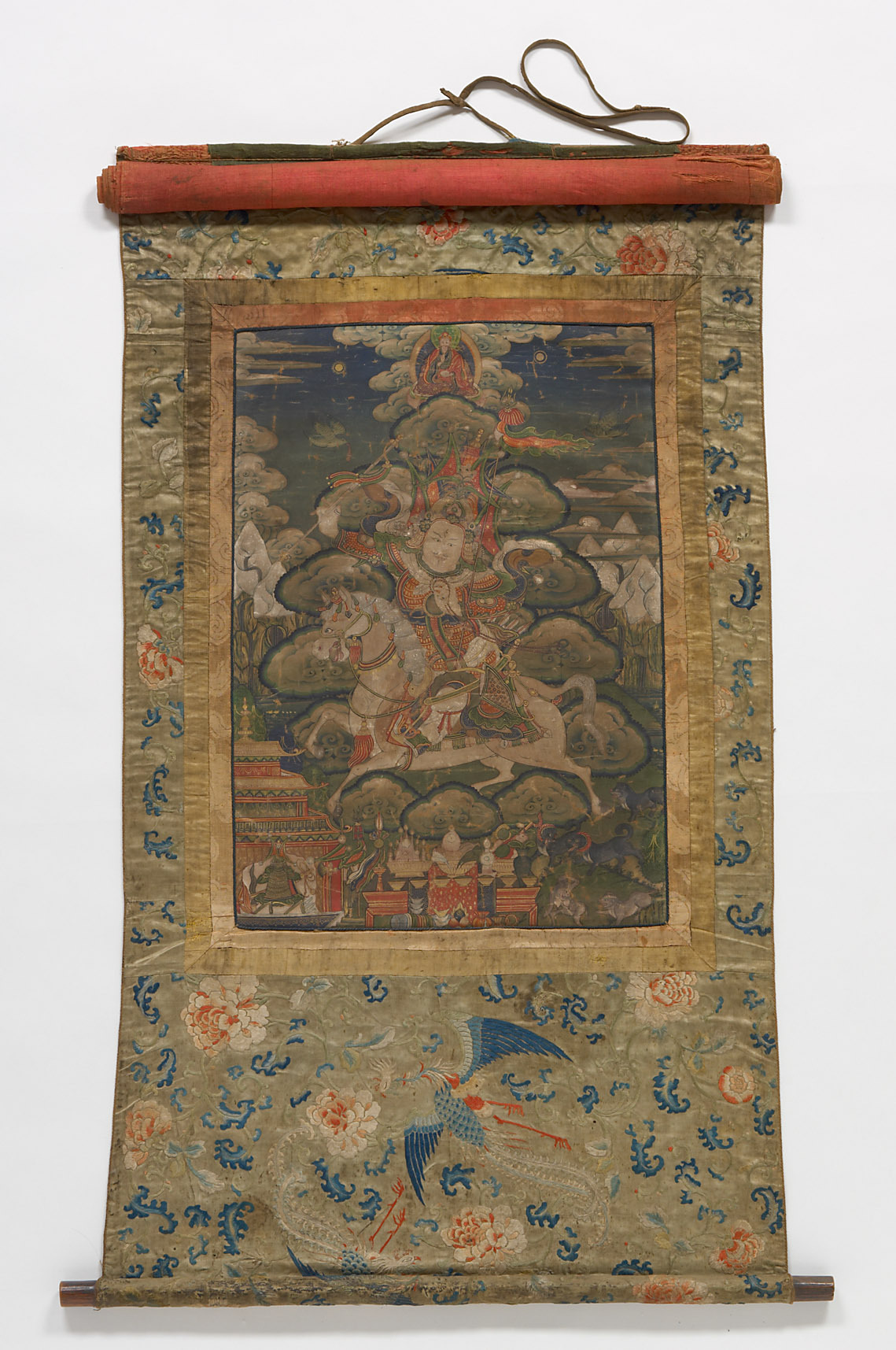If the sacred mountains are depicted as war deities, they are equipped with bow and arrow, and wear suits of armour. At the upper edge of the canvas, we find gods and high lamas of erudite Buddhism as reference to the integration of these originally pre-Buddhist deities into the divine world of Buddhism. The lower edge shows offerings for the deity at the centre of the painting, and figures from his entourage.