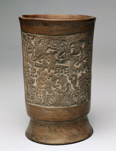 Vessel (Funerary urn?) with sacrificial scene and feather serpent with deities