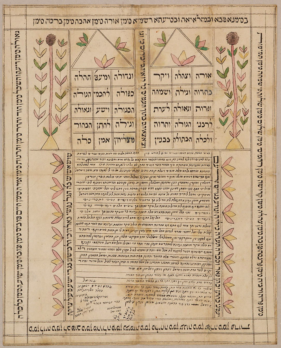 Illuminated Manuscript. Ketubbah (Jewish marriage contract). Traditionally written in Talmudic-era Aramaic, the ketubbah (Hebrew for “written thing”) details the groom's obligations toward his future wife after marriage. For the financial protection of the bride, the ketubbah also states how much the husband or his family must pay or promise to pay if he decides to divorce without cause or in case of death. Jewish marriage contracts produced in the Near Fast are usually written on paper, and their decoration is strongly influenced by Islamic art in their lack of figures and the use of aniconic motifs. Persia was the main center of ketubbah illumination in the Islamic world. The text of the contract occupies the center of the page, while biblical verses form the inner and outer frames. Verses from Isaiah (61:9-10) form the outer frame of the ketubbah. The the groom’s name is “Elijahu ben Matitja(hu)”, the bride’s name “Batscheva bat Ja’akov”.