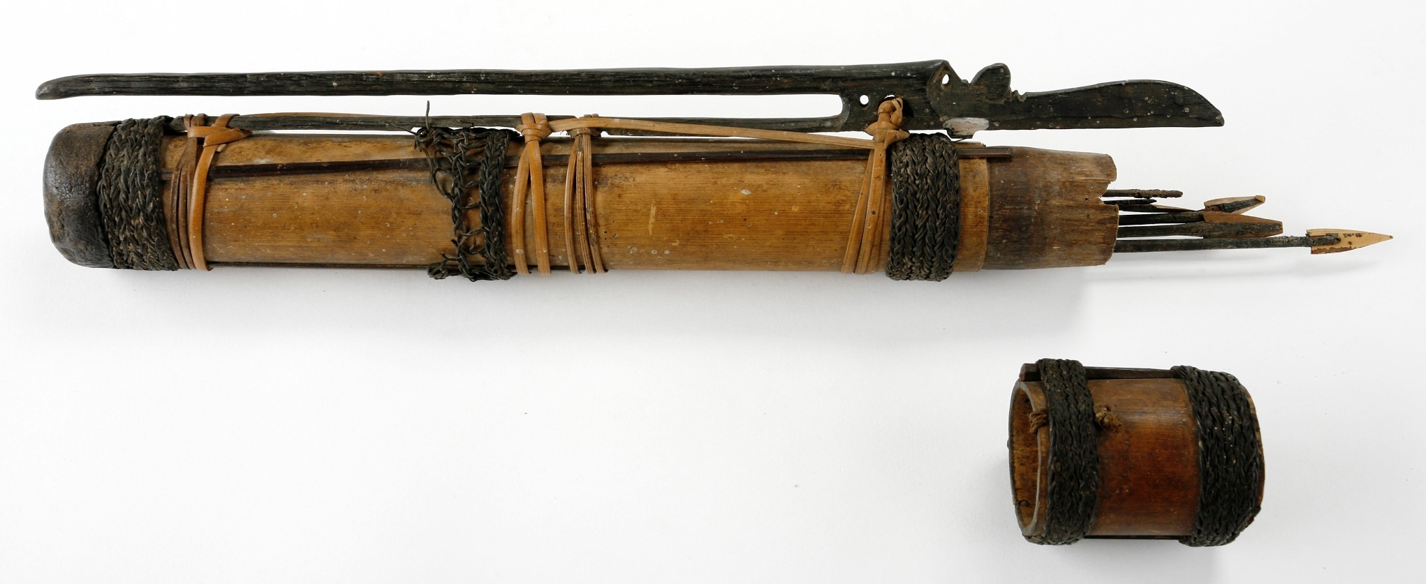 Two quivers, belonging to the blowguns described, both made of bamboo tubes, equipped with easily closing lids. On the outside, decoratively covered with finely split rattan and bamboo braiding, on the side a long hook of buffalo horn which is used to hang the quiver on the belt. Inside the quiver thin bamboo arrows, as described above; with extremely fine heads which have very fine barbs. Heads and barbs, very brittle, break off as soon as the arrow enters a body, and since these heads are also dipped into a poisonous plant juice before they are used, they cause, as mentioned above, infections and high fever which leads more or less quickly to death."