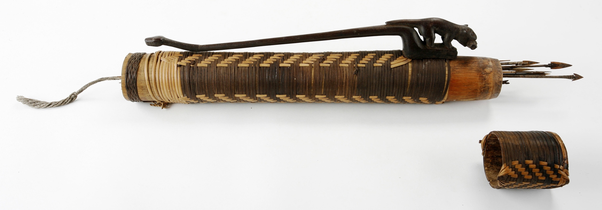 Two quivers, belonging to the blowguns described, both made of bamboo tubes, equipped with easily closing lids. On the outside, decoratively covered with finely split rattan and bamboo braiding, on the side a long hook of buffalo horn which is used to hang the quiver on the belt. Inside the quiver thin bamboo arrows, as described above; with extremely fine heads which have very fine barbs. Heads and barbs, very brittle, break off as soon as the arrow enters a body, and since these heads are also dipped into a poisonous plant juice before they are used, they cause, as mentioned above, infections and high fever which leads more or less quickly to death."