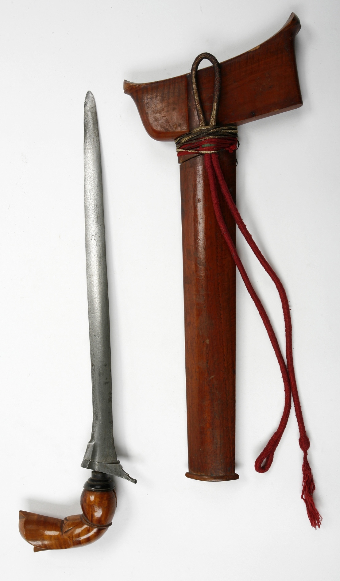 The blades of these daggers belong to the second type, are straight, more or less well damascened, of different lengths and breadths and all of them are without poison grooves. The wooden sheaths and the wooden handles are simply worked."