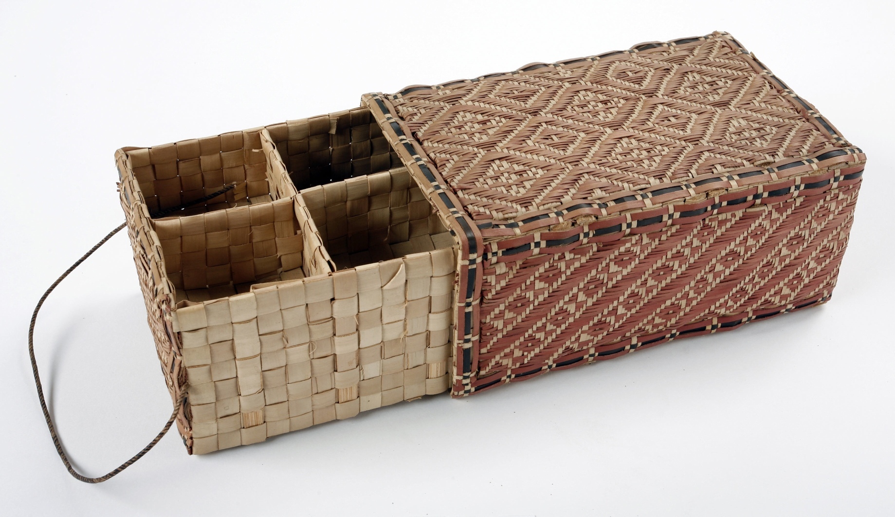 Two small boxes of woven, finely split, red-painted lontar leaves which are similar to the previous boxes in that they are slid into a drawer. They are used to keep tobacco and also to store different constituents for betel use."