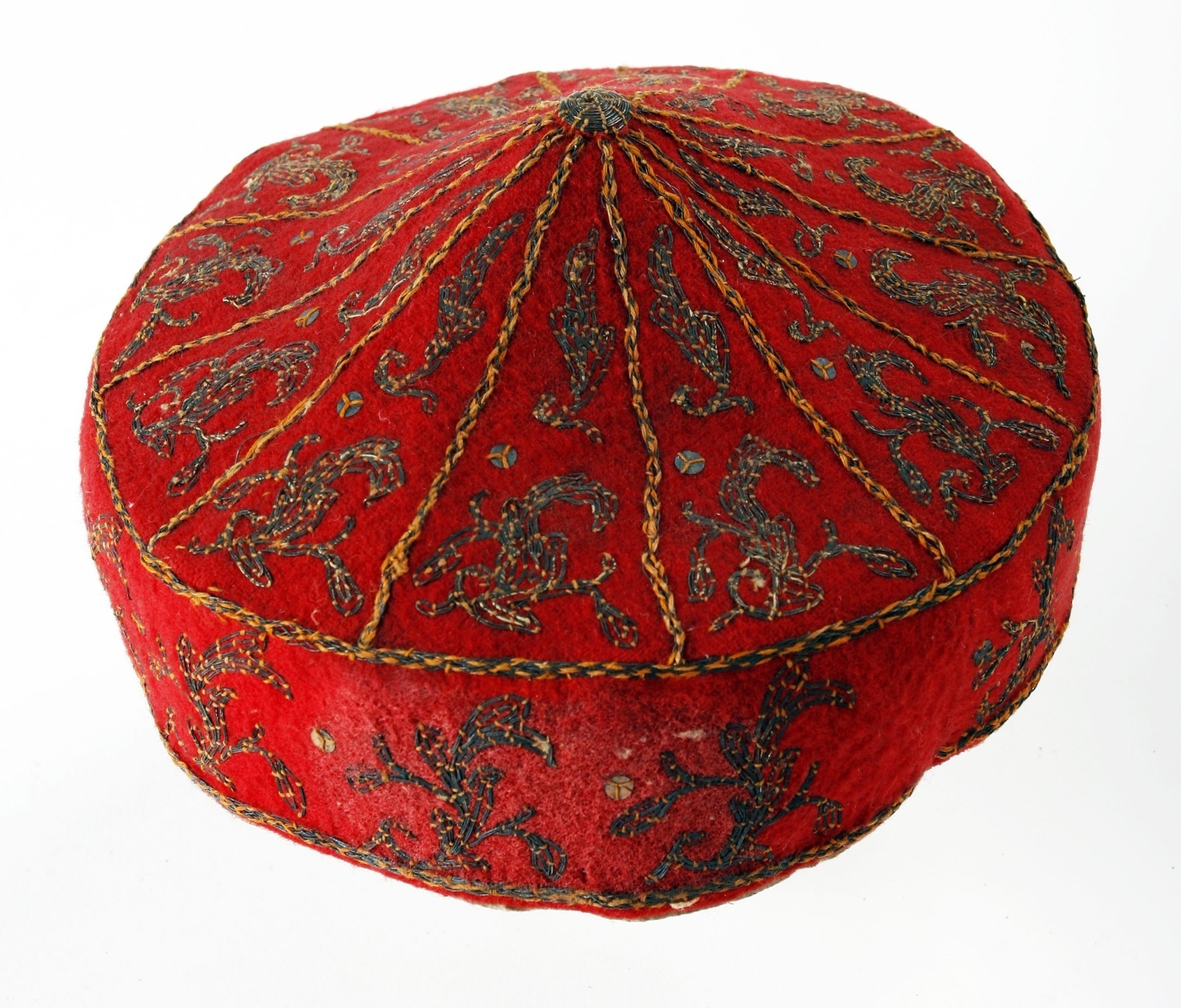 In its form this is similar to the earlier ones, but not woven but made of European paper that has been covered on the outside with red cloth. In addition, the red cloth is decorated with various figures of thin gold threads. This cap is only worn in certain places by noblemen."
