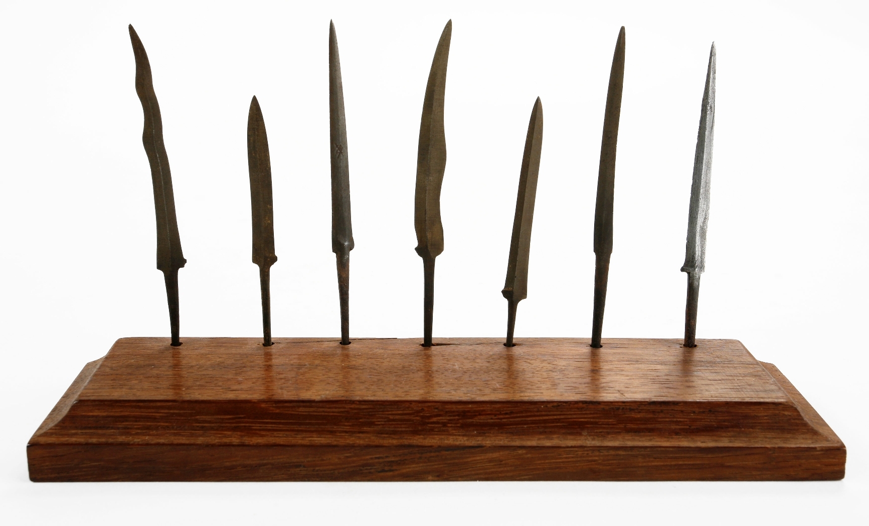 Seven small knives about five cm long, two-edged and pointed, from finely ground steel which are tied onto the natural spurs of a cock that has been selected to fight.