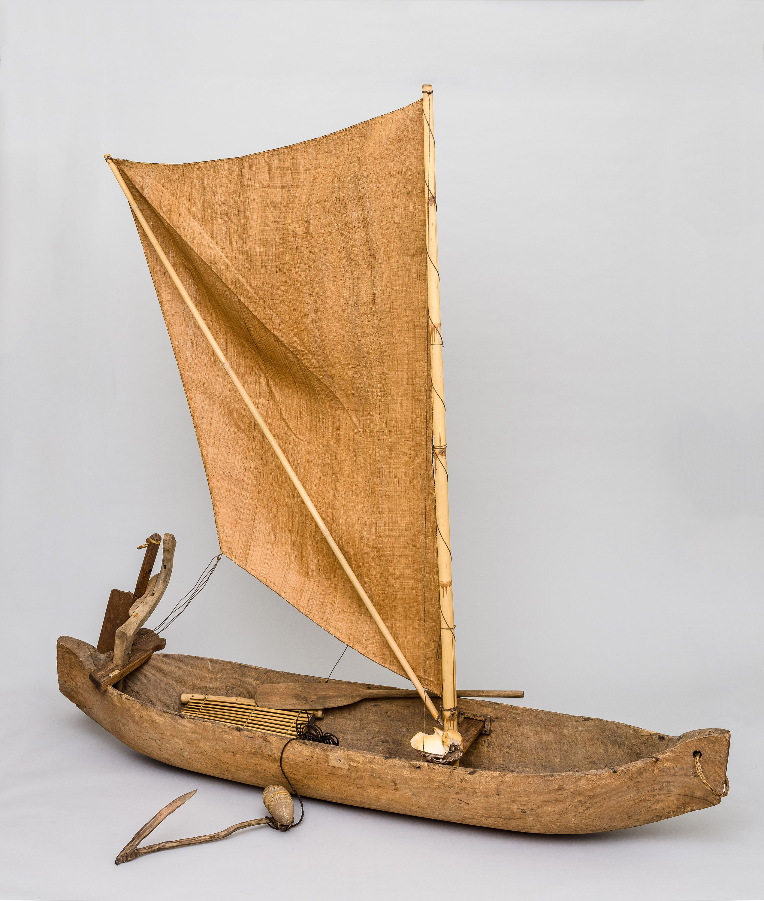 The canoe is the typical means of transport of all of the inhabitants of the coastal areas of the Indian Archipelago. It is called "Lipa-lipa" and is carved and hollowed out from a tree trunk in a very tedious way. The present example belongs to the smaller type, only intended for two people. There are some which are only for one person, with which the natives, using a rudder, glide over the water as quick as an arrow. On the other hand there are large, beautifully worked canoes fitting easily twenty people, five to six meters long, again carved from a single tree trunk.