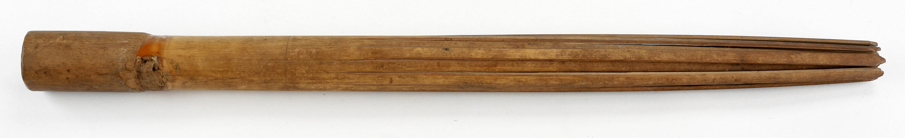 Bamboo pole about a foot long which has been split into many parts from one end almost to the other. When these split ends are hit against each other or against another object, a strong rattling noise is created which expels the evil spirits."