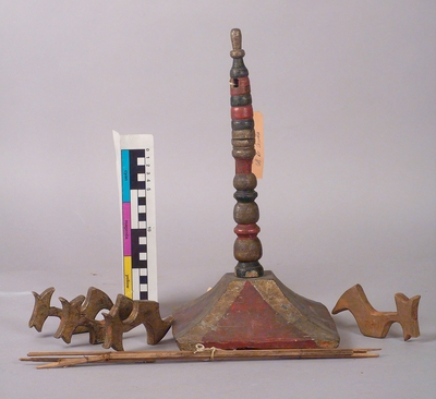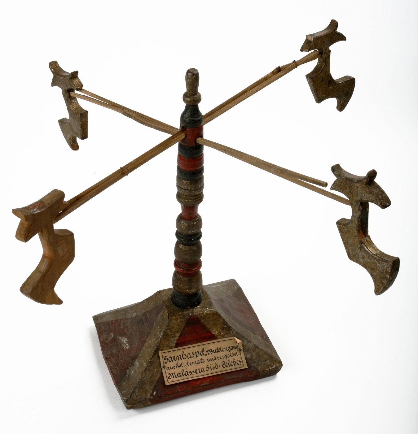 A yarn bobbin made of a foot-long, vertical, round rod which can rotate on its axis on a vertical base. At the top of this rod there are two openings bored through the rod in which four small adjustable rods have been inserted horizontally, at right angles. The ends of these small rods have half-moon shaped little pieces of wood, pointed outwards, in whose concave recess the yarn runs. By means of these adjustable crosswise rods, it is possible to give the strands to be formed different lengths. The whole object is painted green and red and is gilded."