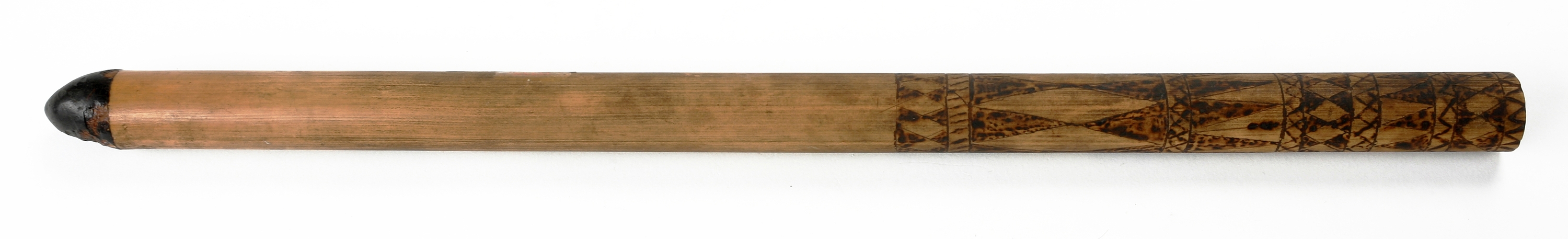 Six pieces of bamboo tubes, on the outside decorated with black-dyed carvings. In these are stored the spools "Aru-pelu". The natives of the Indian Archipelago have reached a high level in the weaving arts. It is not considered as a craft but is the possession of the whole society, that is to say, the women. On Sumatra, namely on the east coast of this island, as well as on North Sumatra, in the realm of Aceh, true works of art are made. The perfection comes from the great age of this art, which has at any rate been known to the natives for centuries and was probably the first thing they accepted from the Asian culture. Silk fabrics are made, artfully interwoven with gold wire, which have a value of many hundred, even thousands of Gulden. The cloth made on South Celebes is no doubt second only to those mentioned form Sumatra. We want, therefore, to treat the products in the collection in the same order."