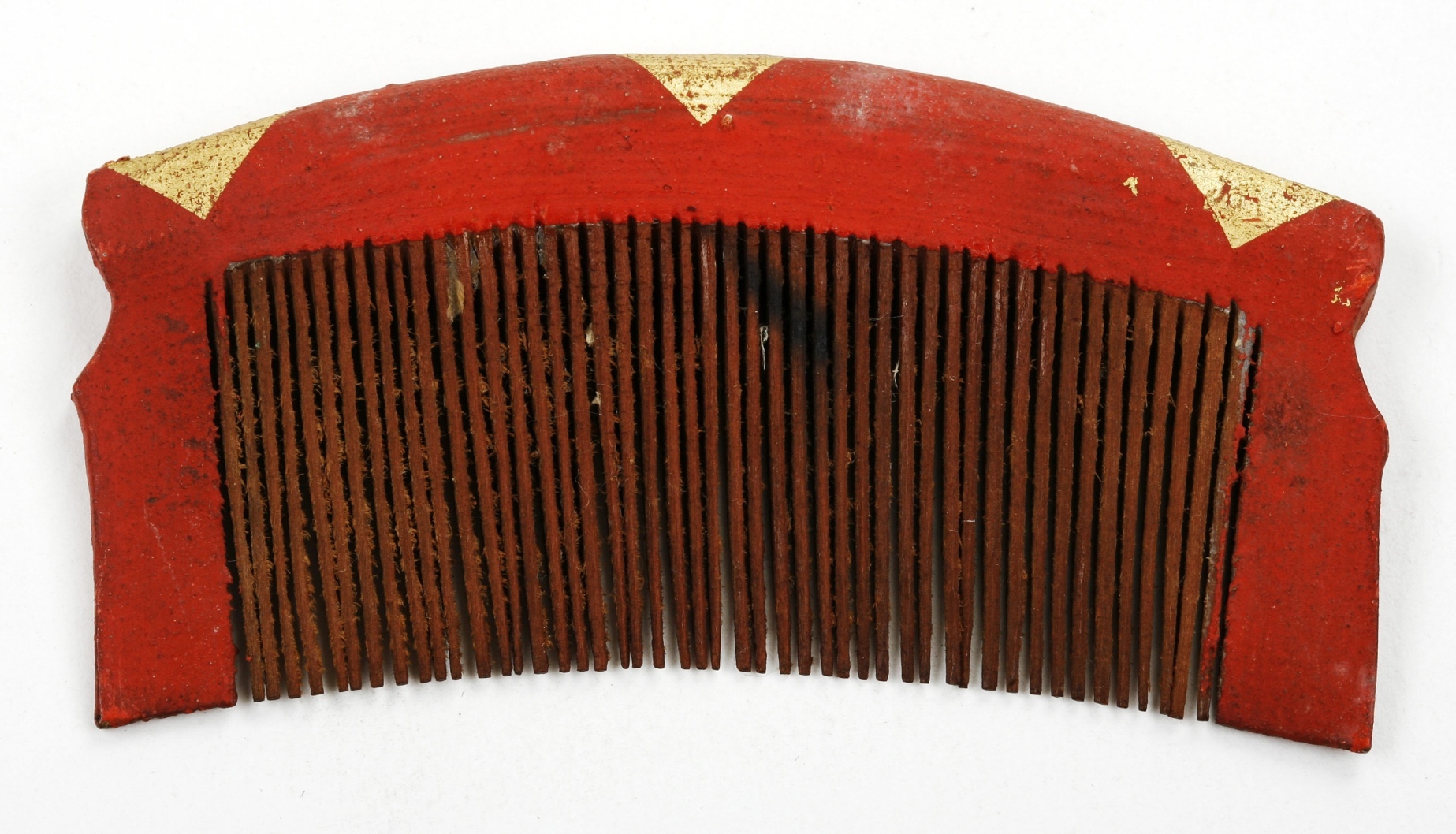 Six combs of different shapes made of buffalo horn and wood, used by the men and women to comb their hair. The men wear their hair long everywhere in the Indian Archipelago and the culture demands that they take just as much time and care as the women for their hair. It is understandable, with their thick hair growth - as is the case generally with the natives - in the tropical heat and the length of the hair, which is always kept greased with coconut oil, that the parasites have a pleasant place to stay. The hair of each native, without difference of sex, age or rank, is alive with the well-known hectapods. Searching for lice is just as normal a daily occupation for the nobles and privileged people as for the poorest man and it is seen as a very natural activity and no one feels ashamed about it. One often sees whole crowds of men and women crouching on the ground very attentively searching around in each other's hair. The combs that are of use on South Celebes have either been made by the natives themselves or imported from Java and China."