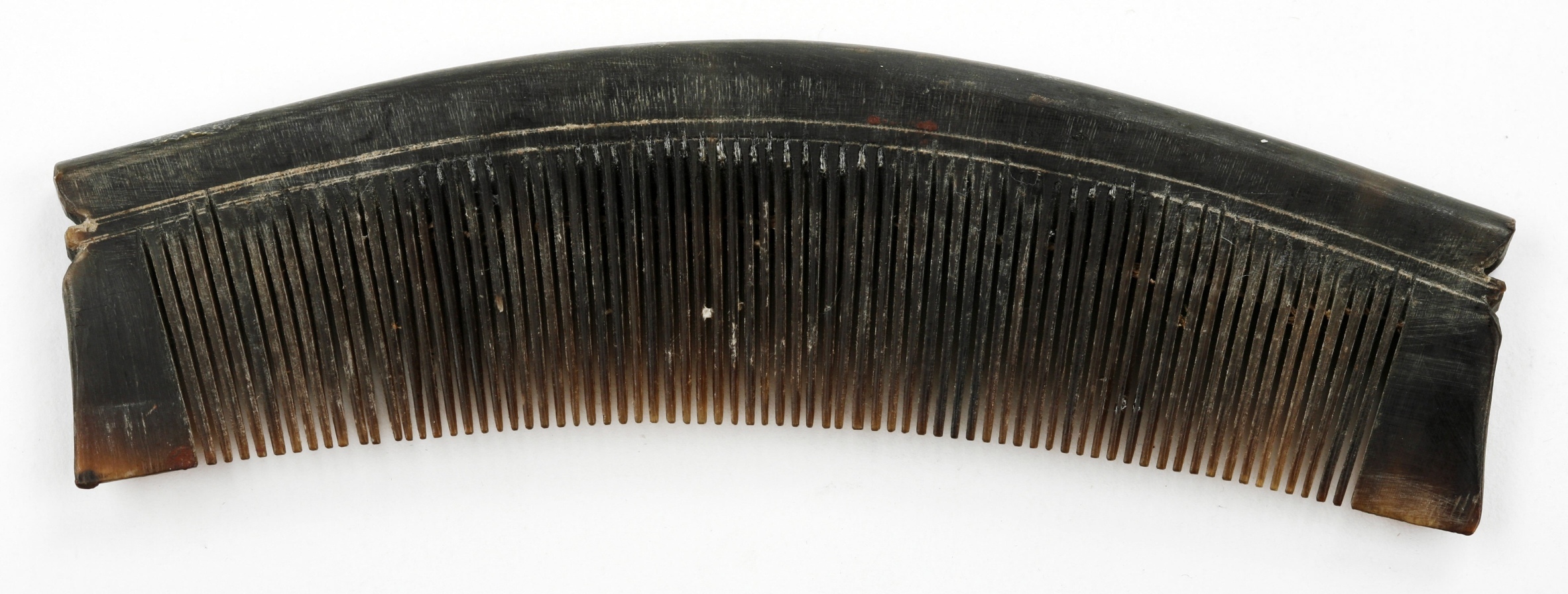Six combs of different shapes made of buffalo horn and wood, used by the men and women to comb their hair. The men wear their hair long everywhere in the Indian Archipelago and the culture demands that they take just as much time and care as the women for their hair. It is understandable, with their thick hair growth - as is the case generally with the natives - in the tropical heat and the length of the hair, which is always kept greased with coconut oil, that the parasites have a pleasant place to stay. The hair of each native, without difference of sex, age or rank, is alive with the well-known hectapods. Searching for lice is just as normal a daily occupation for the nobles and privileged people as for the poorest man and it is seen as a very natural activity and no one feels ashamed about it. One often sees whole crowds of men and women crouching on the ground very attentively searching around in each other's hair. The combs that are of use on South Celebes have either been made by the natives themselves or imported from Java and China."