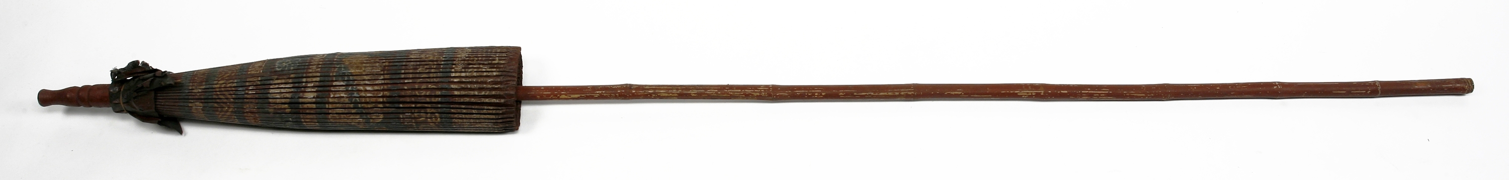 Two large parasols of painted, oiled paper with a rod that is two meters long, which is carried by servants for the privileged Javanese. This large parasol is the sign of distinction among the Javanese native officials, showing rank and standing of the owner. Thus princes carry parasols which are made entirely of gold cloth, the highest officials have varied colored parasols, where the various rings or stripes of different colors show the rank and grade of these people. In some areas the European high officials also have parasols corresponding to their rank carried behind them by uniformed servants."