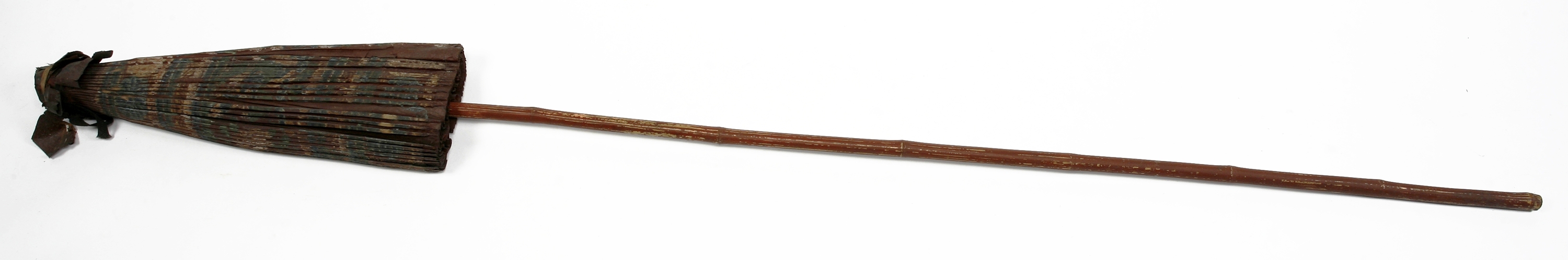 Two large parasols of painted, oiled paper with a rod that is two meters long, which is carried by servants for the privileged Javanese. This large parasol is the sign of distinction among the Javanese native officials, showing rank and standing of the owner. Thus princes carry parasols which are made entirely of gold cloth, the highest officials have varied colored parasols, where the various rings or stripes of different colors show the rank and grade of these people. In some areas the European high officials also have parasols corresponding to their rank carried behind them by uniformed servants."