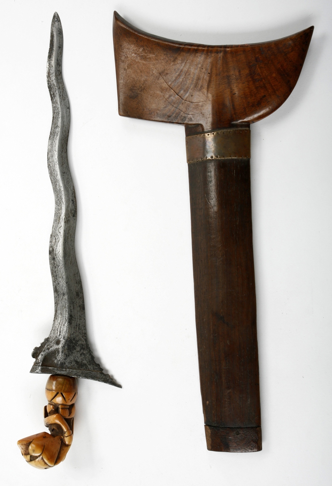 The damascened blade is also a wavy blade, but smooth, without ribs or poison groove. The sheath is simple, wooden, very broad. The hilt carved from a rhinoceros horn, a relief image of Buddha that is very primitively made. The weapon is very old."