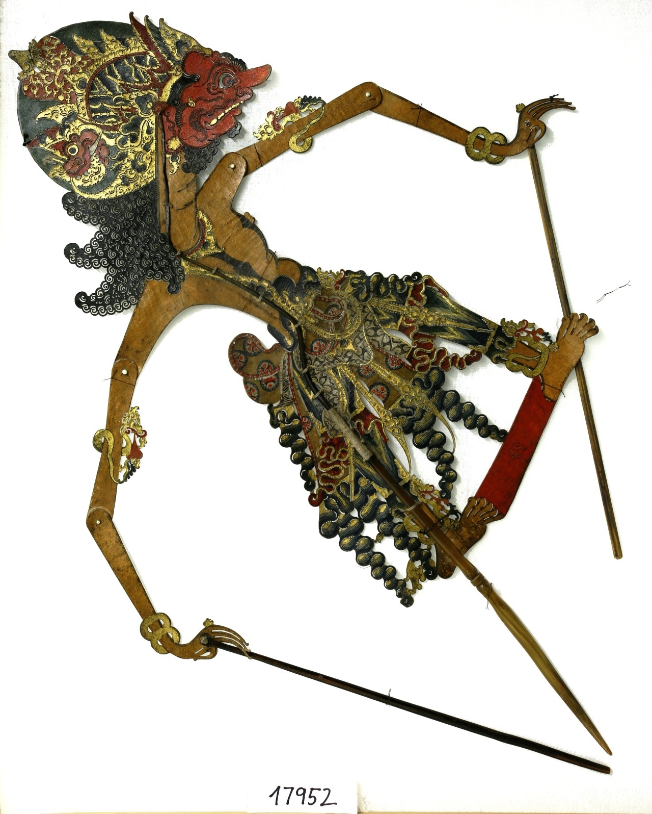 Figures cut out of buffalo leather, about two "shoes" high, colorfully painted and richly gilded. The figures represent fantastic beings with typical Hindu profiles, the heads adorned with Indian crowns, the body unshaped, the nose large, hands and feet small. The joints of the hands and arms are moveable, as with marionettes, and connected to sticks hanging down with which they are moved by the directors, who sit below the figures. The figure itself is also held from below by a stick of horn, which tapers toward the top, runs through the whole figure and stiffens it. The most remarkable thing about these figures is the meticulous cut-out work of the decorations, a lacy, finely open-work which is done with small half-round and round chisels. These figures are used to present truly national theater performances, "Wajang", which are so wide-spread and popular on Java.