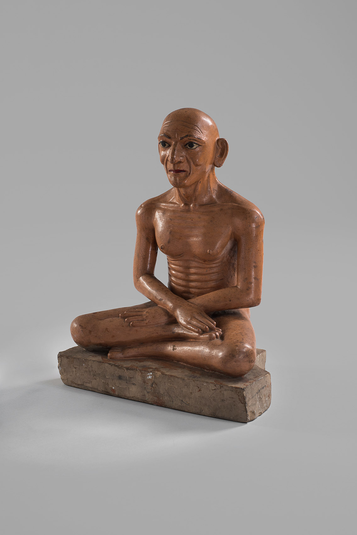The unusually expressive naturalistic sculpture made of polychrome sandstone shows a man in a gesture of deep meditative contemplation. He realizes physical calm and spiritual harmony.