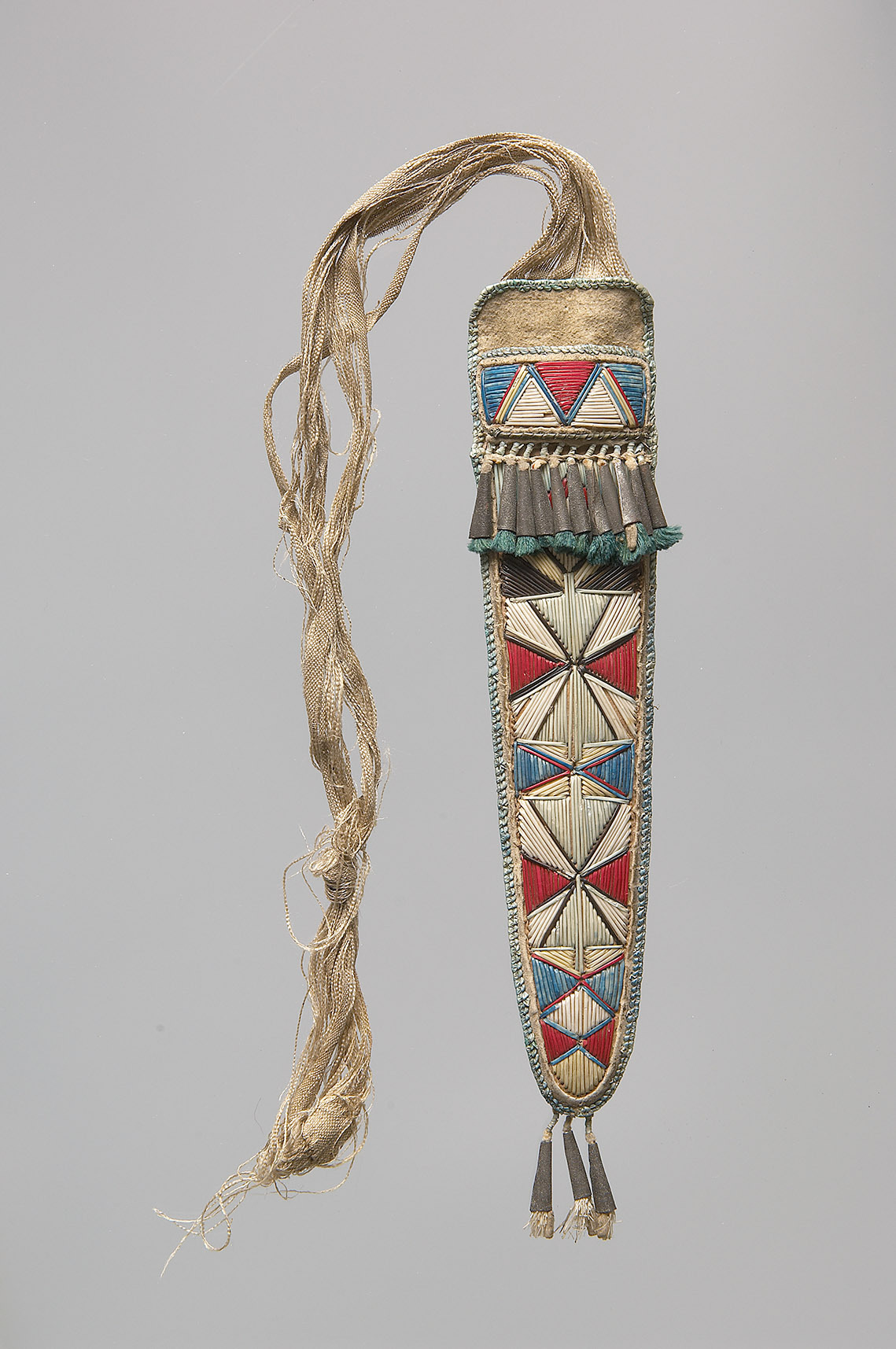 Leather, metal, birch bark, dyed porcupine quills