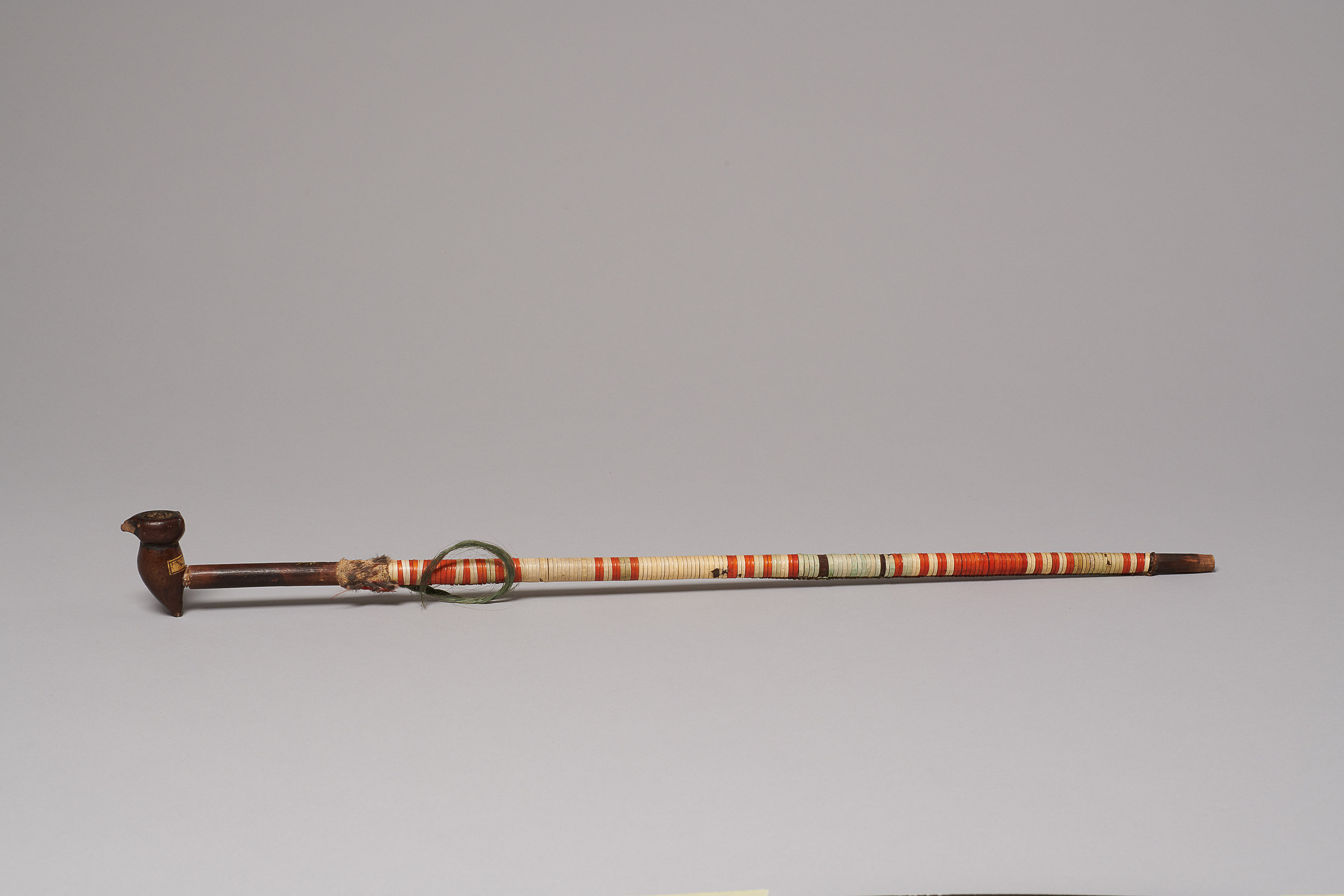 Holz, Catlinit, Stachelschweinborsten, Haar, Leder, Vogelbalg, Farbe