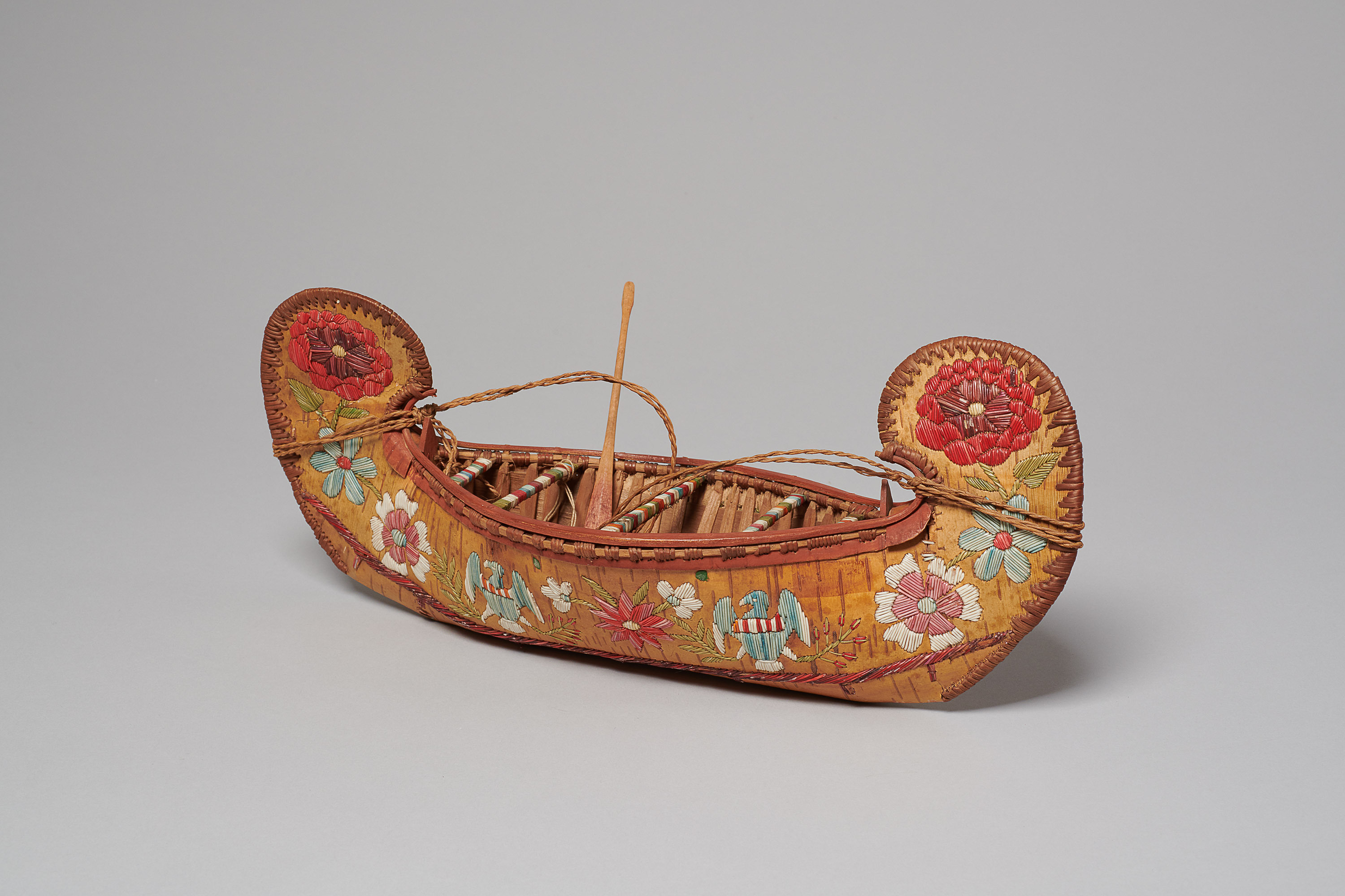 Birch bark, dyed porcupine quills, elk hair, cotton, wood, silk
