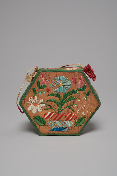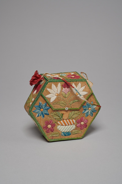 Birch bark, dyed porcupine quills, elk hair, cotton, wood, silk